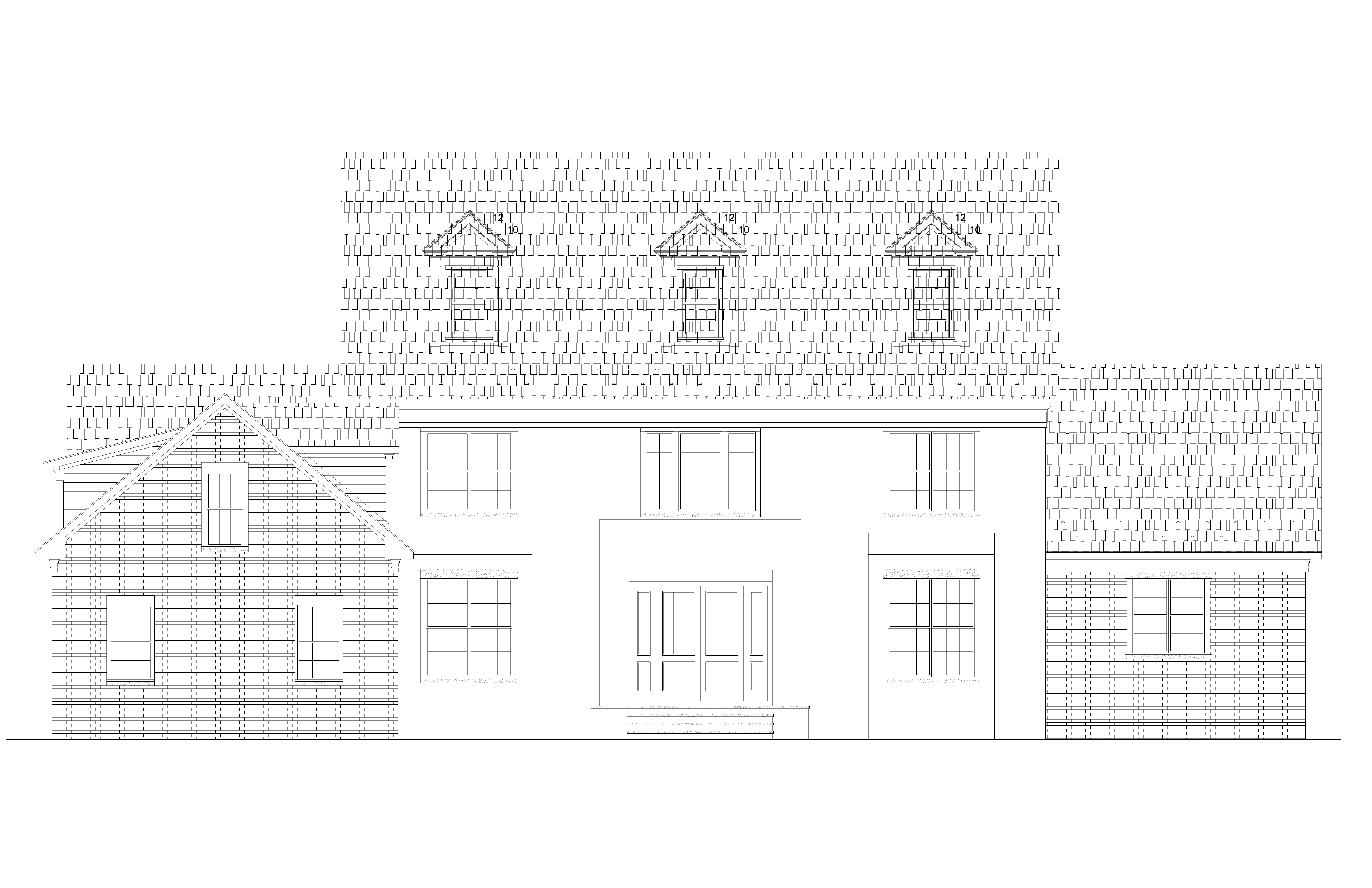 a picturesque suburban house featuring a classic design with a spacious front porch and detailed black shingles the walls of the house are painted in elegant cream complemented by a solid wooden front door in rich mahogany the roof is covered with textured charcoal gray shingles large windows with crisp white frames let in ample natural light the atmosphere is serene and inviting set during a sunny afternoon with a bright blue sky lush green lawns surround the house dotted with vibrant flowerbeds in shades of lavender pink and yellow all brick is cream color stone surround for front door and flanking windows