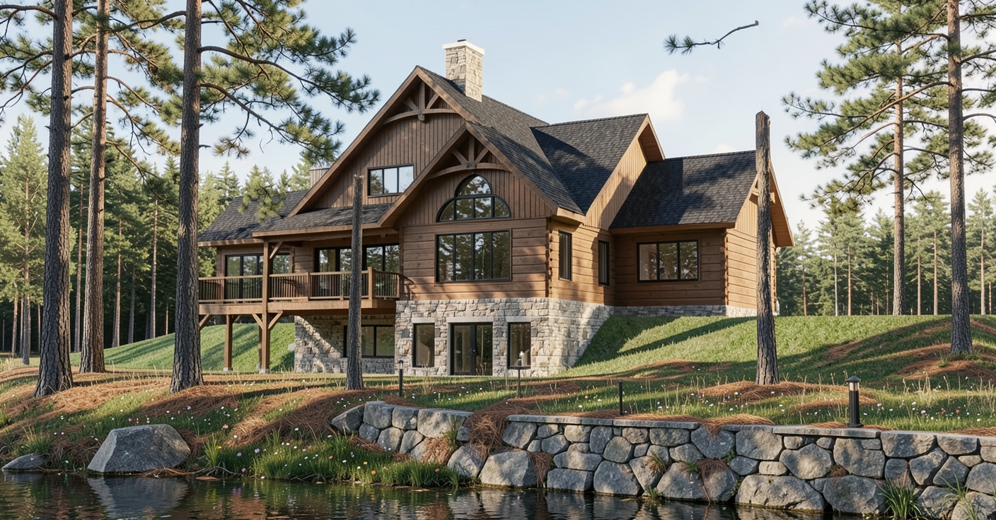 make this picture look photorealistic cut grass with pine needles ground flowers add tall pine trees in the foreground middle ground armour stone retaining wall at lakes edge in the very near left front foreground black shingle roof black windows