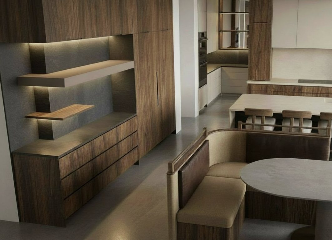 make middle shelf at left of photo a light stone material like countertop at right of photo