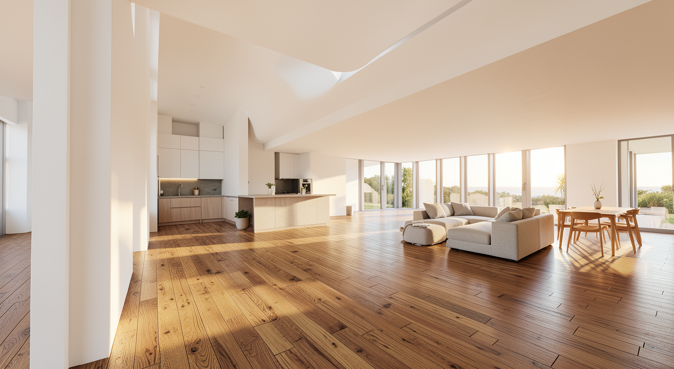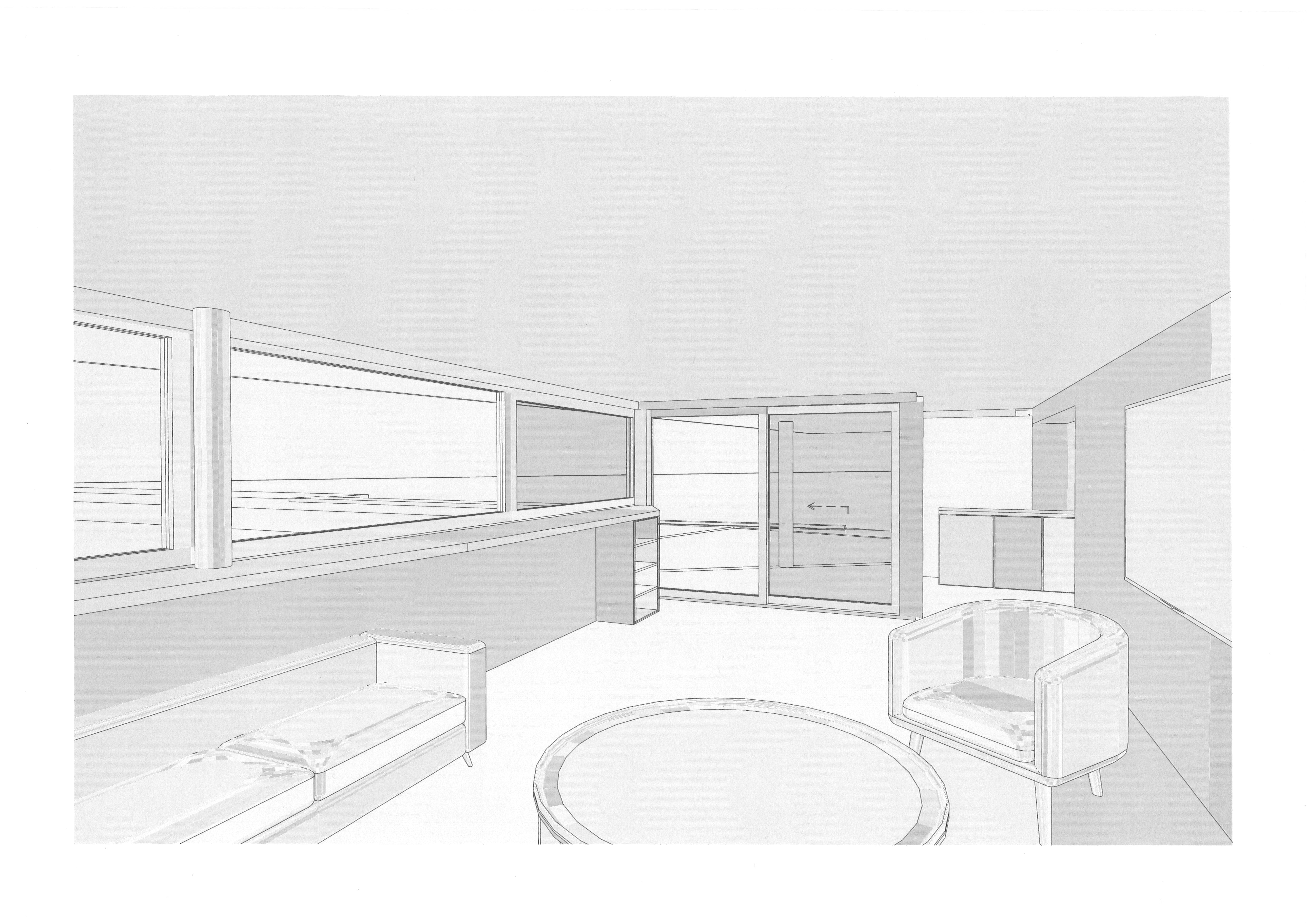 cr er un espace d t comprenant un salon un espace bar sous la tablette du bandeau horizontal le bandeau donne une vue sur la piscine qui est au niveau de seuil du bandeau je veux une lumi re du matin ajout un personnage sur un tabouret avec une boisson en main le reste de la pi ce est libre jusqu l angle vitr e dans le fond droite il y a une cuisine d t au travers du coulissant d angle on voit une zone ext rieur avec un rev tement de sol en b ton tu peux ajouter du mobilier contemporain l ext rieur le style doit tre vendeur et contemporain avec une touche de minimalisme
