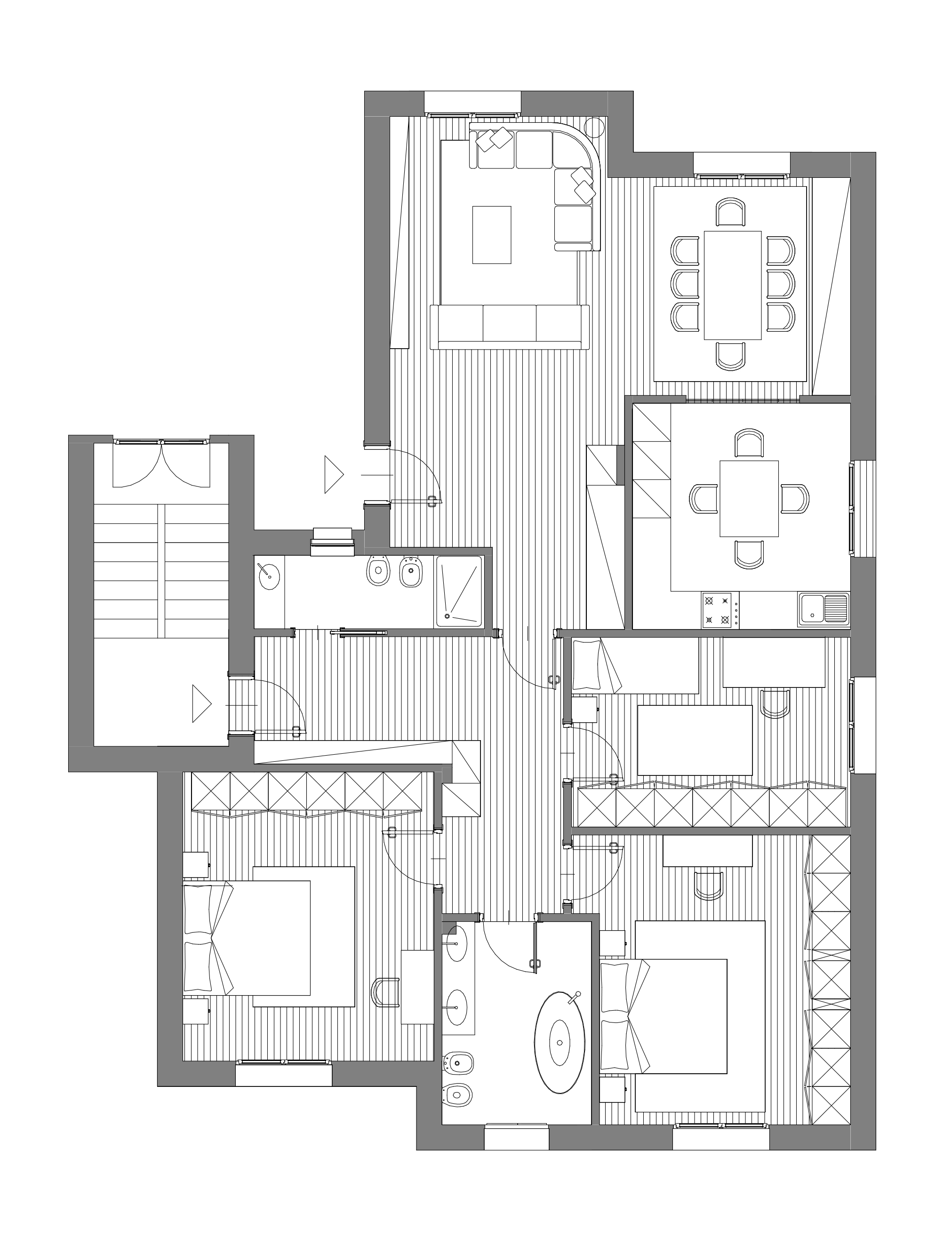 convert this floor plan into a realistic isometric 3d view of a full house show the space from an elevated angle with furniture walls and details visible render a modern and luxurious apartment layout with an open concept design use a soft color palette with light beige for the walls and warm oak wood for the floors the living room features a plush gray sectional sofa with teal and gold accent pillows the dining area showcases a sleek marble table with elegant dark wood chairs the kitchen has a minimalistic design with white cabinetry and stainless steel appliances in the bedrooms opt for soothing lavender tones with plush area rugs and contemporary furniture the bathrooms are accented with white tiles and silver fixtures overall atmosphere calm sophisticated and inviting with plenty of natural light streaming through large windows use the same furniture as shows on the plan do not change the orientation of the floorplan