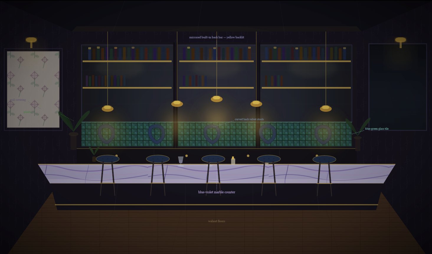 exterior shot dark romantic boutique hotel bar with a blue violet analogous color palette purple marble navy velvet forest green boucle blue green glass tile warm brass hardware and pendant lighting throughout mirrored built in back bar curved back bar stools walnut floors lush plants moody candlelit atmosphere wide 3 4 editorial shot photorealistic 8k