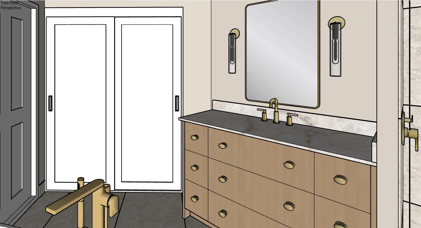 make the shower on the back wall into sliding doors with a 2 clean shaker remove the mirror on the cabinet doors