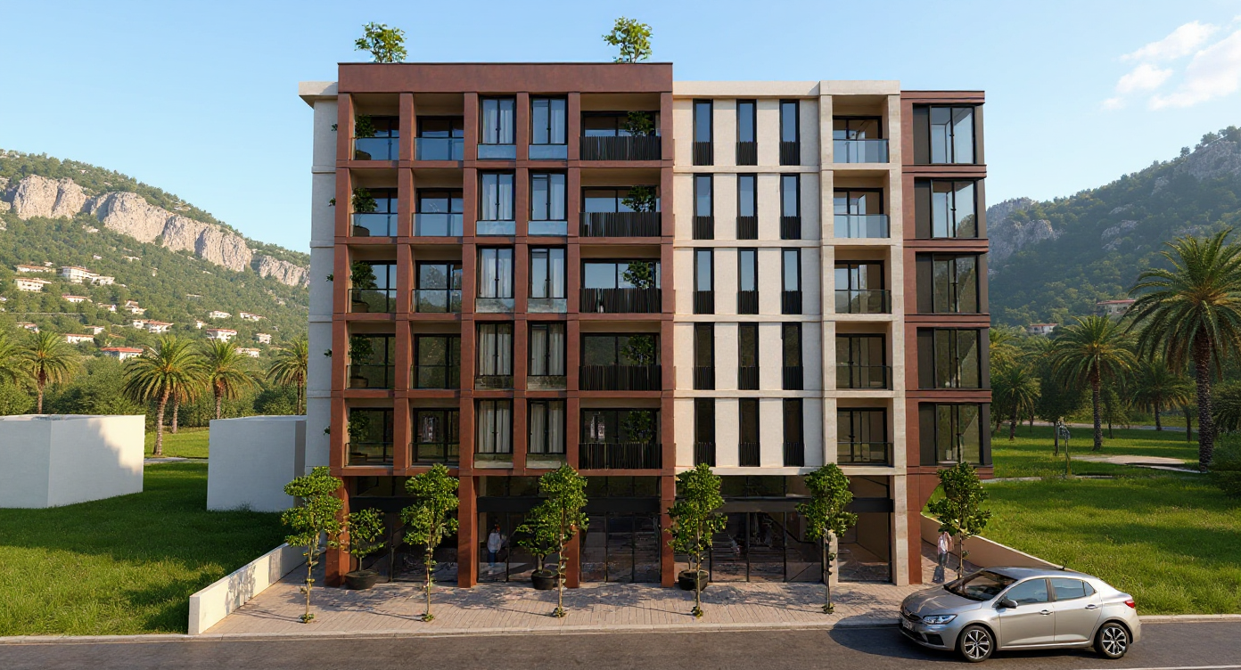 make the environment more dramatic including the sky the yellow is a stone look cladding with vertical grooves