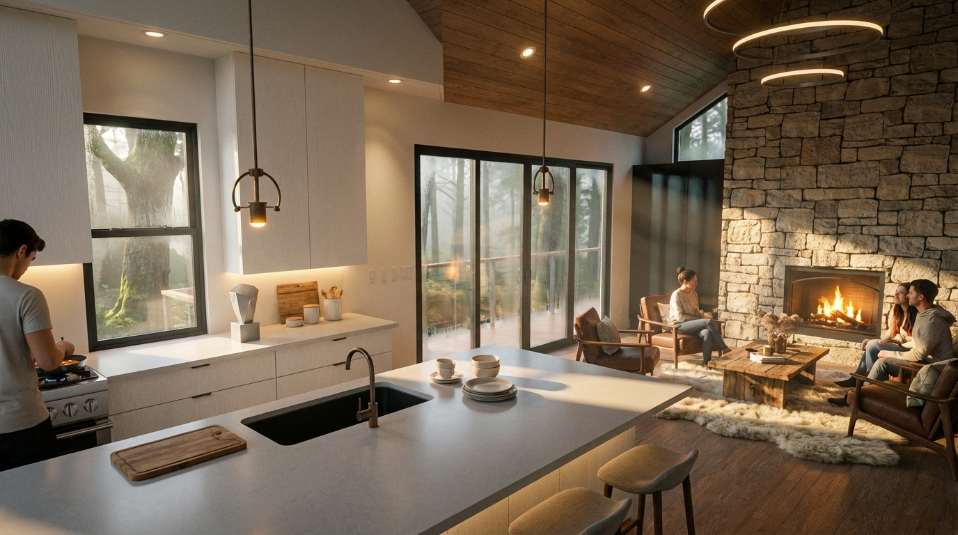 exterior shot task enhance and embellish the provided building design into a photorealistic architectural masterpiece create panoramic view style art direction high end architectural photography archdaily editorial style 4k high resolution ultra detailed and implementation feasible components main subject a modern building setting situated in a lush nordic forest exterior with during the golden hour with long soft diagonal shadows details add physical material micro details like visible wood grain concrete pores and realistic reflections on glass surfaces also add furniture and lighting camera lighting camera shot with a 35mm wide angle lens low angle perspective to emphasize scale lighting volumetric sun rays filtering through trees warm interior ambient lighting visible through windows to create depth and life color color balance the photo warm and cold color tone mixtures and good contrast constraints maintain the exact structural silhouette of the original design no over smoothing or plastic ai look prioritize raw unretouched texture fidelity ensure all structural lines are perfectly vertical and parallel no lens distortion add people and additional entourage to show a lively scene