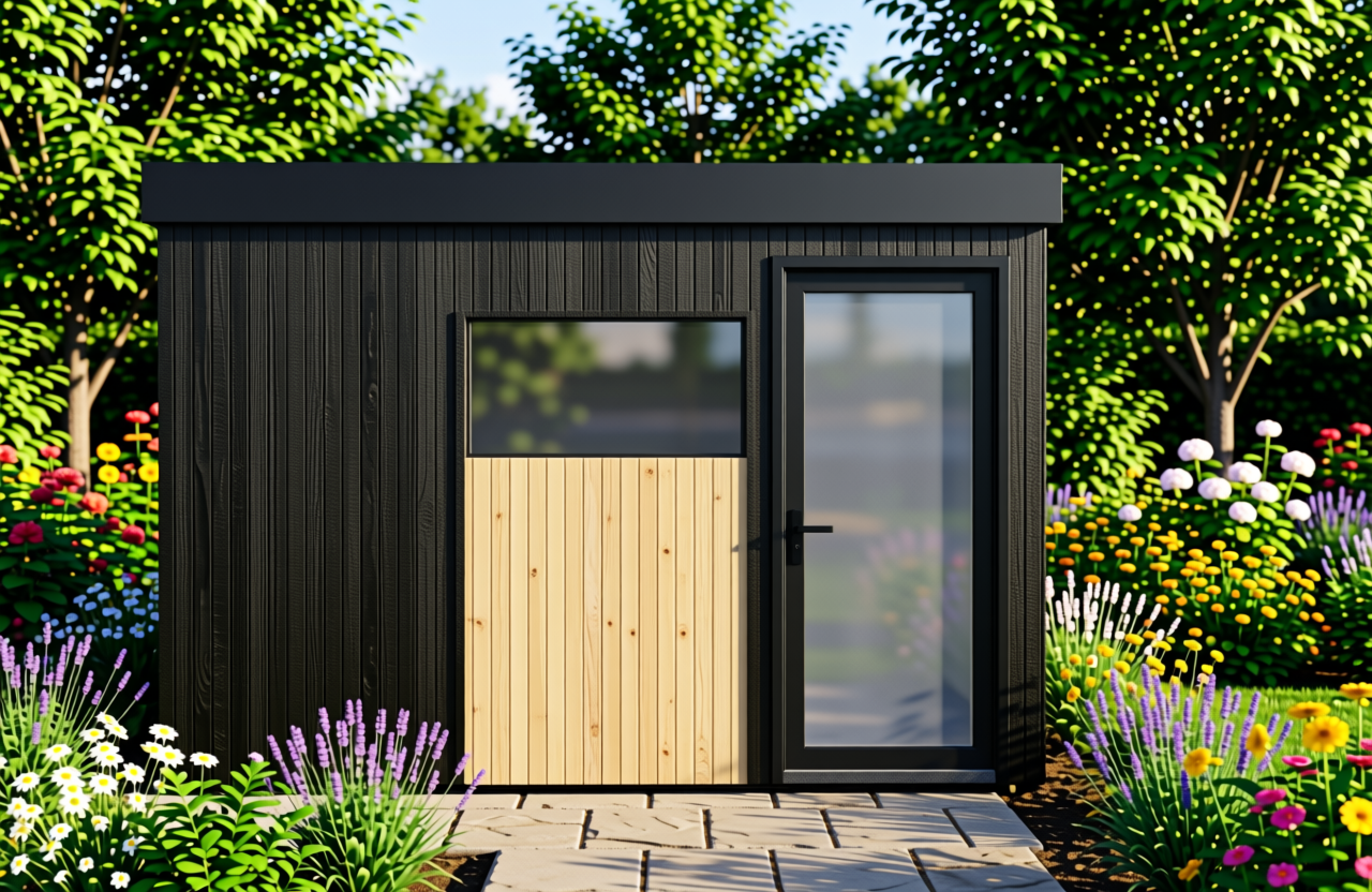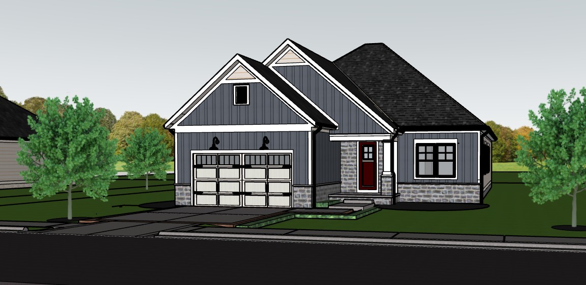 high definition image modern farmhouse design maintain geometry materials and colors add some low landscaping to the right and left of the base of the home black windows with glossy surface and reflections white solid panel garage door glass and mullions on the top of the door like the reference image white gutters and downspouts add a 12 ornamental tree on the right and a 12 tall willow tree on the left in the foreground with mulch beds at the base realistic grass add a hedgerow separating the neighbor house on the left morning sun with blue sky and clouds show the street slightly wet with some reflectivity white louver in the gable over the garage show porch light on realistic concrete apron in front of the garage doors and sidewalk show a tree line in the distance with a open field in front of it and behind the home photo realistic view