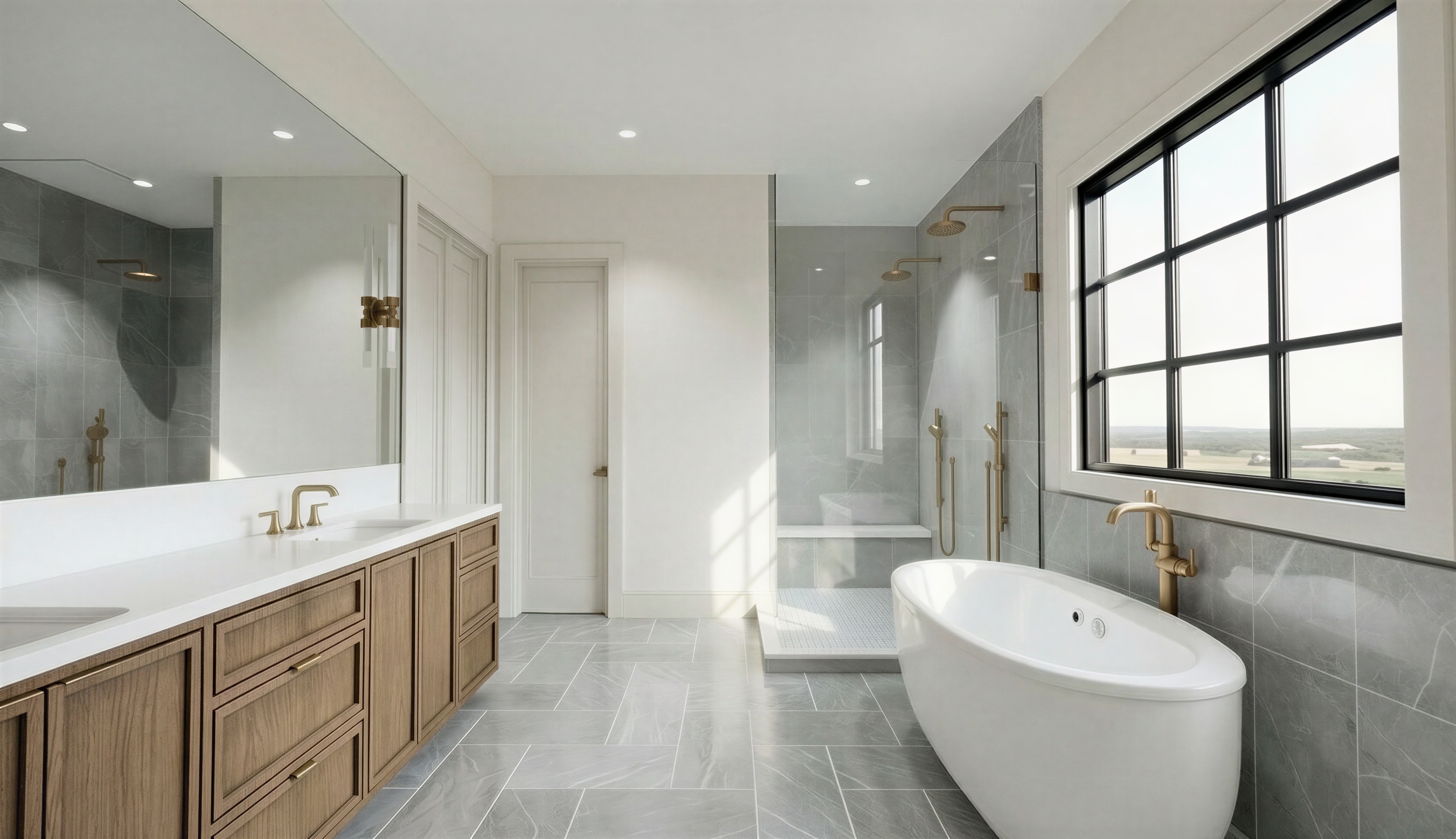 enhance this image so it appears professionally staged for a luxury real estate listing while maintaining the exact architecture layout geometry materials and finishes shown in the original rendering do not change or adjust the architecture tile cabinetry countertops plumbing fixtures lighting fixtures colors or design all materials and finishes must remain exactly as shown add very minimal restoration hardware style staging so the space feels subtly styled but not cluttered on the back wall add two neutral bath towels hanging from a modern robe hook the towels should hang naturally and appear soft thick and spa like the styling should feel refined and intentional similar to an upscale hotel or restoration hardware display the towels should be neutral in color and neatly hung creating a minimal but elevated styling detail on the left side vanity sinks only add a very small number of tasteful counter accessories such as one simple neutral soap dispenser one small tray with a folded neutral hand towel these accessories should appear clean minimal and high end similar to styling used in luxury hotel bathrooms or restoration hardware displays do not add accessories to the right side sinks do not add additional towels baskets plants or decorative objects the staging should remain restrained and intentional allowing the architecture and materials to remain the primary focus maintain a high end editorial photography style suitable for luxury real estate marketing and architectural digest style interiors lighting should remain soft and natural with balanced daylight and subtle highlights that emphasize the materials already present in the space the final image should appear clean refined minimally staged and highly realistic similar to a professionally photographed luxury real estate listing do not modify architecture layout materials fixtures or finishes only add the minimal staging described above