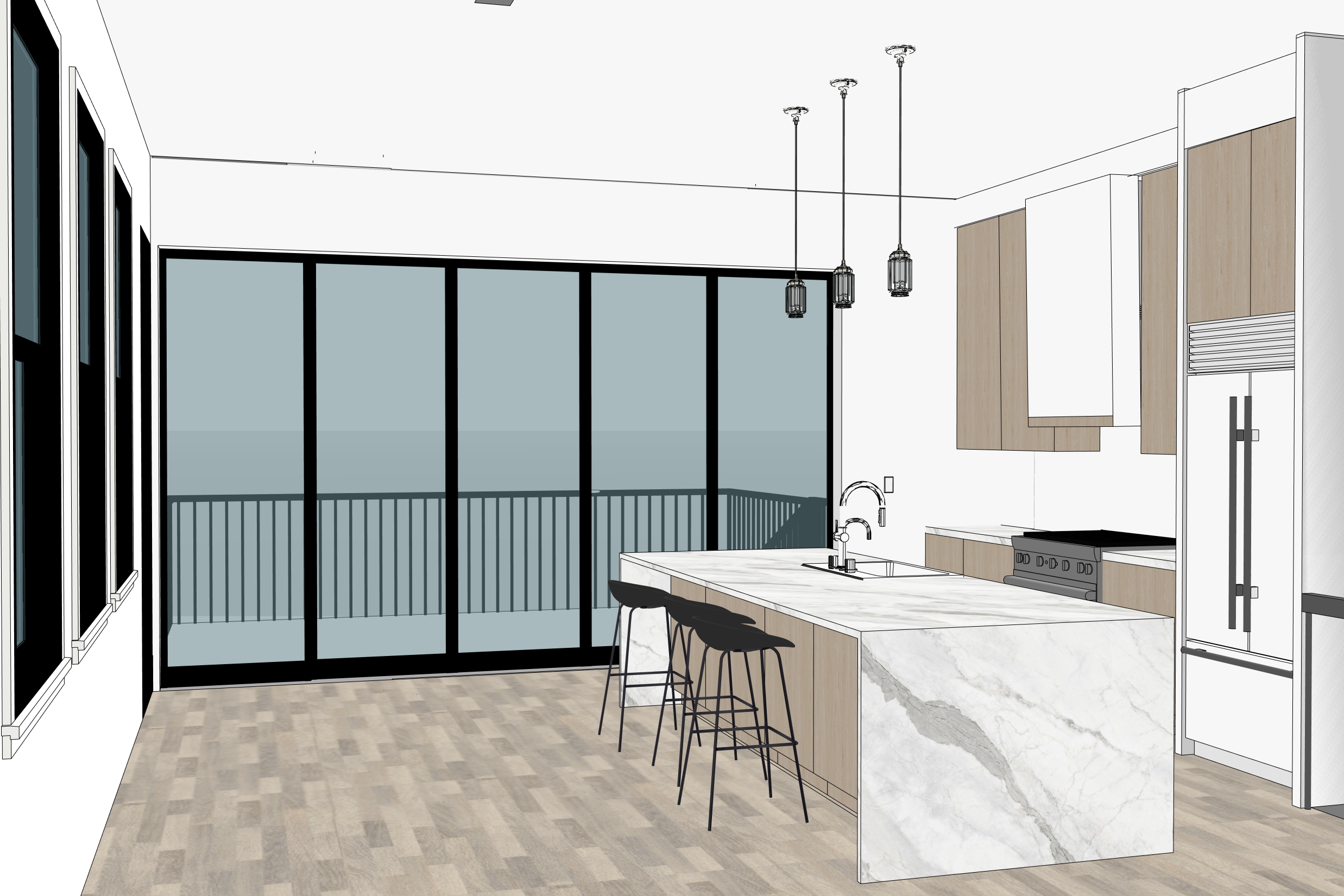 view outside window is a deck with rear yard on lower level