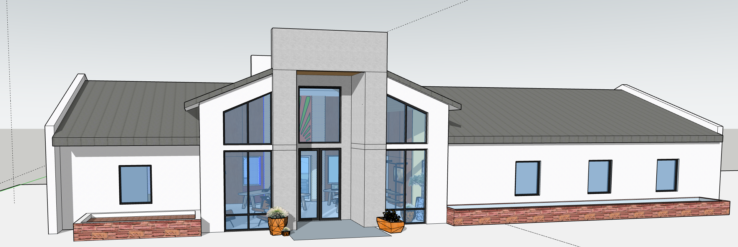 change roof to copper metal change the planters to stacked flagstone wall landscaping to be of the sonoran desert palette walls to be stucco and of the earth tone palette location of this building is on the site of the civano growing yard off of old south nogals road in tucson arizona make this scene midday and add people and a slightly cloudy background