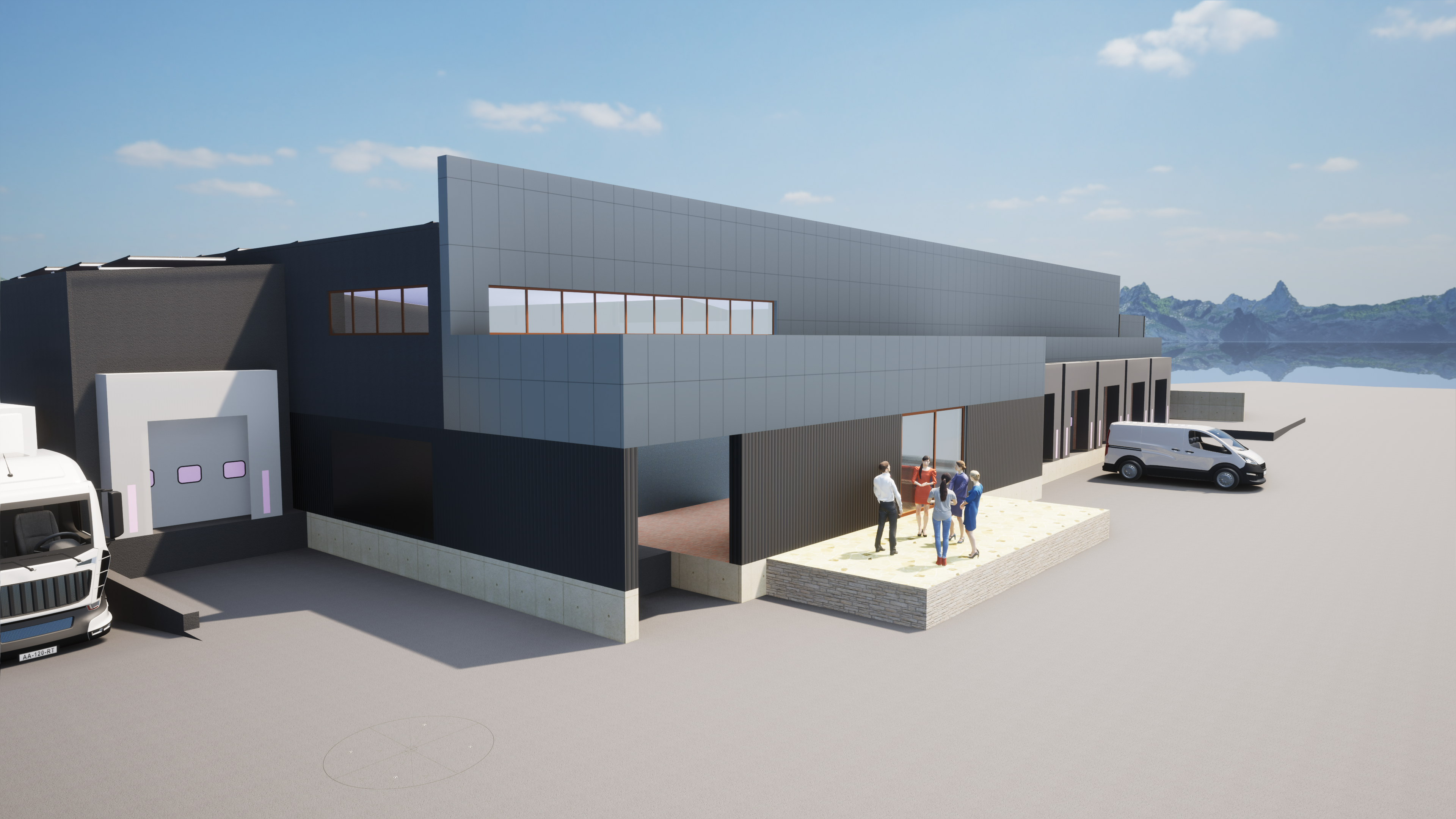 dise o de edificio industrial moderno con fachada de paneles met licos gris claro superficie lisa y estructura modular incorporar una entrada distintiva compuesta por una estructura met lica de color rojo brillante con paneles perforados que permiten transparencia parcial en la parte superior de esta entrada debe colocarse un r tulo con el texto carnicas dominguez en letras tridimensionales de color blanco montado sobre los paneles rojos ventanas rectangulares de aluminio con marcos met licos grises distribuidas de manera sim trica en la fachada incorporar unas puertas enrollable industrial de carga gris bajo en la parte mas lejana sostenida por tirantes met licos vegetaci n baja y rboles verdes en el fondo cielo parcialmente despejado estilo fotorrealista iluminaci n suave natural diurna
