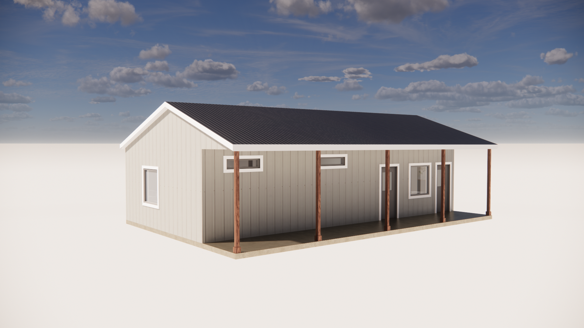 you are a professional image renderer you create the highest grade renderings around and specialize in architectural renderings this is the front elevation of a metal building with a metal roof create a high resolution photorealistic image of this structure keep the windows as they are where they are keep the doors as they are where they are keep the main structure as it is where it is feel free to change the perspective keep the roofline as it is where is it do not add anything to the structure that i have not asked for the roof is galvalume metal the siding is cream color metal the background will be a texas farm to market road there is a parking lot in the foreground it should be early afternoon with a bright sunny day clear skies the landscaping should be early spring with plenty of color and should be that of an rv park nicely kept but simple