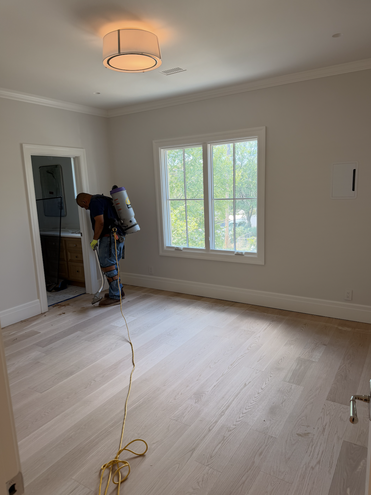 design this room for a young boys bedroom i want there to be white linen curtains with a light blue wave trim on the leading edge of the curtains the curtain rod should be a french return rod the curtains will be blackout so no sunlight can come through add a rug and two twin beds facing the window add a frame tv to the right of the window