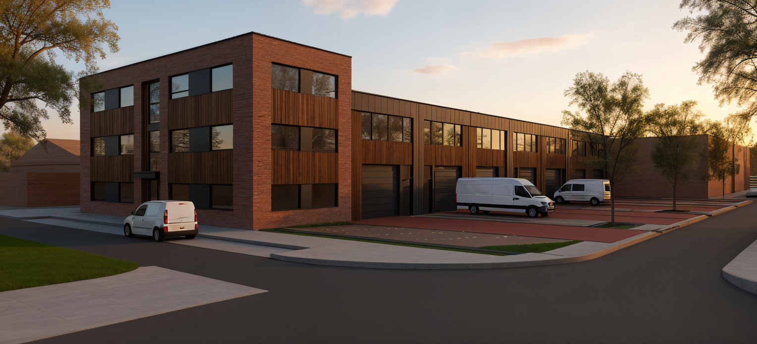 there is vertical placed wood in the panels in between te windows time of day is just before sunset trees are oak trees add a little more sun the building in front has a brick facade with wood in between windows colors of material closer to original add some people in front of the building on the sidewalk it s earlier on the day wood in between windows maintain material colors of original