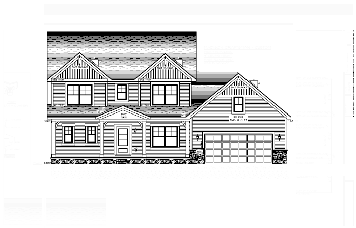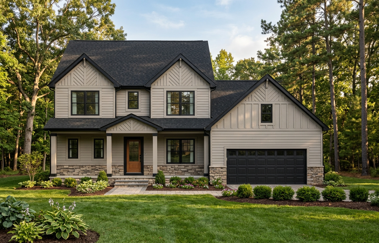 make as photorealistic as possible while keeping textures the same as selection professional landscaping in a lightly wooded scene with good lighting match materials to plan sw6073 perfect greige siding per plan black gutters black windows black trim black roof no stone below porch only low on the garage