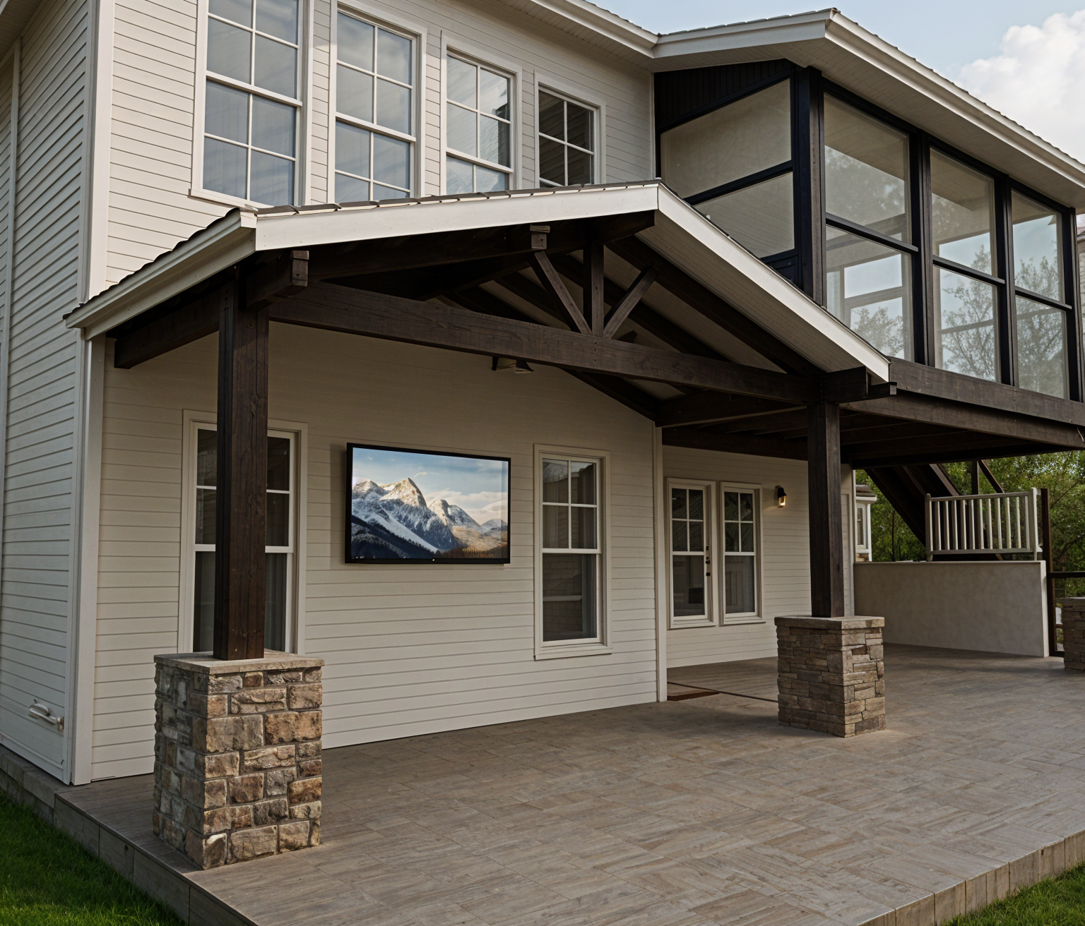 render a modern living room interior with a sleek staircase feature light oak wood for the staircase and wall panels use a soft warm white for the walls design the sofas in a light gray linen like fabric with black legs and arrange the sofa pillows in a natural relaxed way add a white rug under the seating area the center table should be a deep dark chocolate red color choose a cool gray for the floor tiles and incorporate a minimalist shelf with black frames on the wall set the ceiling to a warm white do not add any extra frames or shelves on the brick wall beyond what is shown in the picture the staircase must feature glass panels with a very thin anthracite gray frame subtle and minimal lighting all natural light must come from the camera viewpoint direction no light no light should enter from the right side wall as there is a solid wall there no shadows on th hallway use soft diffused frontal daylight with realistic global illumination add a subtle warm glow coming from the floor lamp without overpowering the scene style render in high end photorealistic quality with real world materials no sketch look no outlines no edge detection and no toon shading preserve the camera angle but ensure a fully realistic appearance