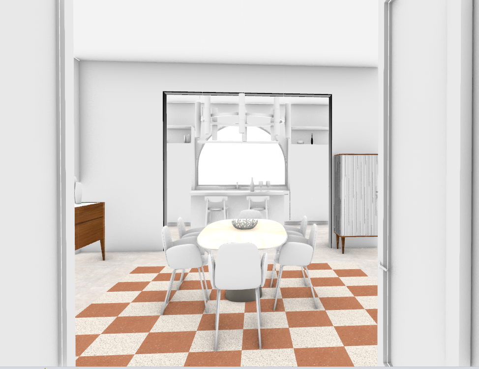 conserva pavimento a scacchi porta ingresso a destra con vetro e maniglia anticata tavolo con pian in marmo calacatta sedie con struttura metallo scuro e rivestimento tessuto beige credenza legno noce con ante vetro cannettato cucina colore bianco venato penisola bianca con piano color tortora sgabelli legno noce finestra ad arco legno bianco con vetro atmosfera rilassante luce naturale eleganza