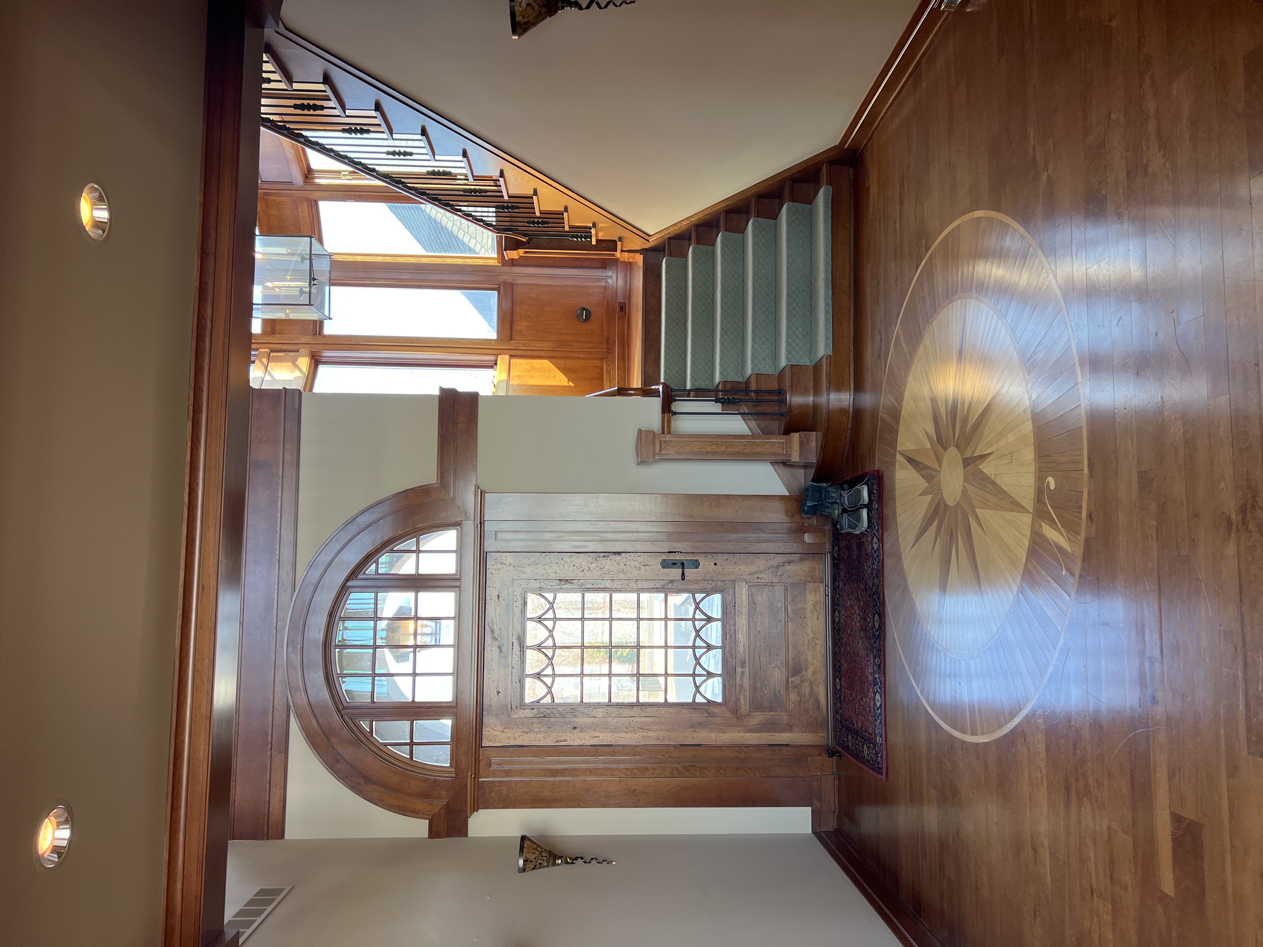change the stairs to a modern floating stair with glass rails paint all the woodwork white make the floors a dark stain add a large glass front door