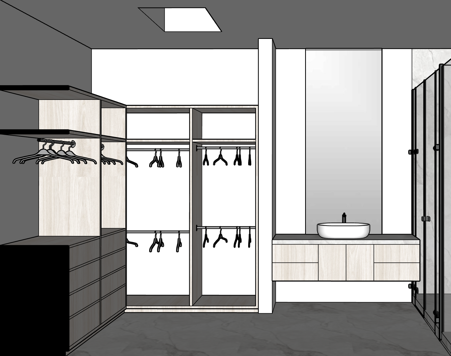 modern walk in closet and bathroom interior render minimalist design with neutral tones light wood finishes and matte black accents open wardrobe with drawers on the left floating vanity with round vessel sink and large mirror in the center and glass enclosed shower with marble walls on the right the floor is a seamless light gray porcelain tile with a very discreet vein texture natural lighting from ceiling skylight soft reflections realistic shadows high quality materials and a clean architectural visualization style