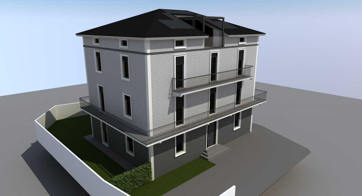 fammi un render a partire da questa immagine senza cambiarne alcuna caratteristica ma fallo di notte aggiungi delle luci a parete centrate tra le porte finestre sia sui balconi su tutti i lati che a piano terra usa quelle luci che fanno il raggio di luce sopra sotto usa una luce non troppo calda illumina anche il cornicione superiore con una stripled continua