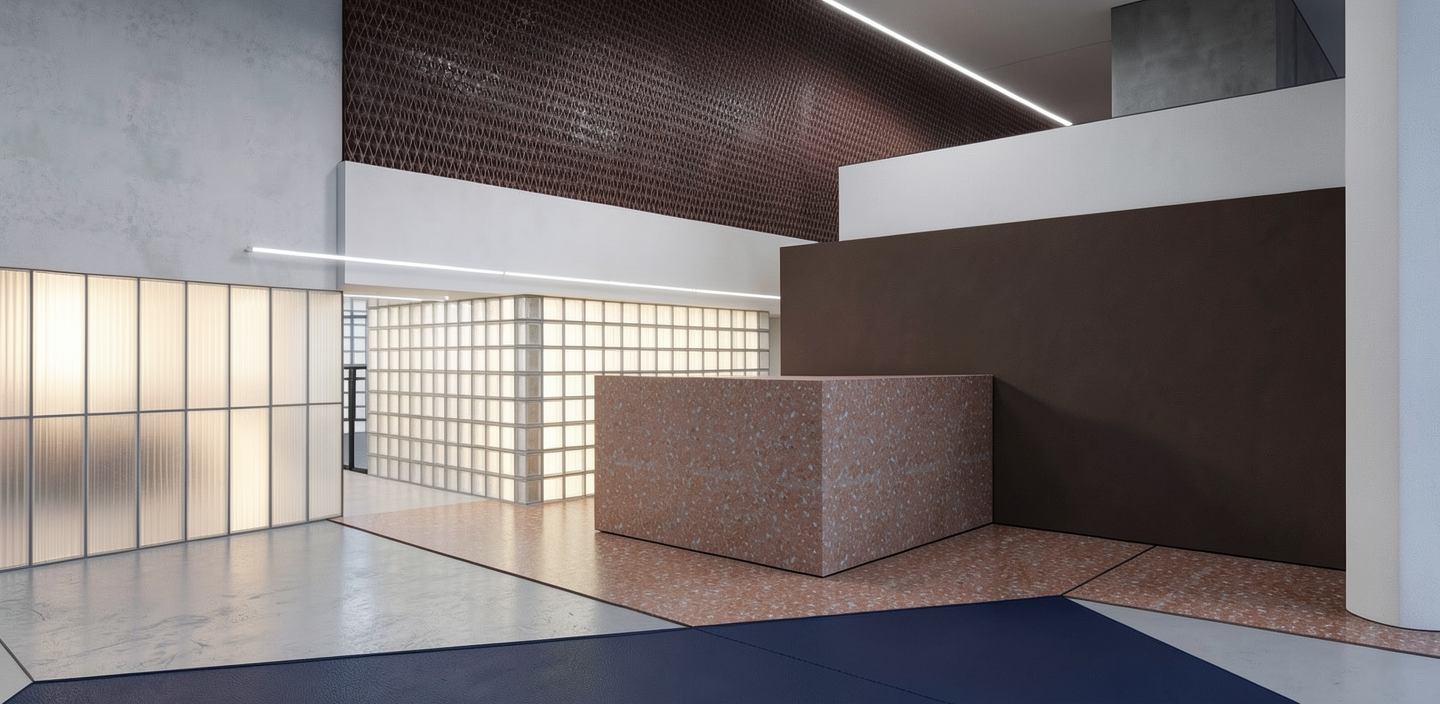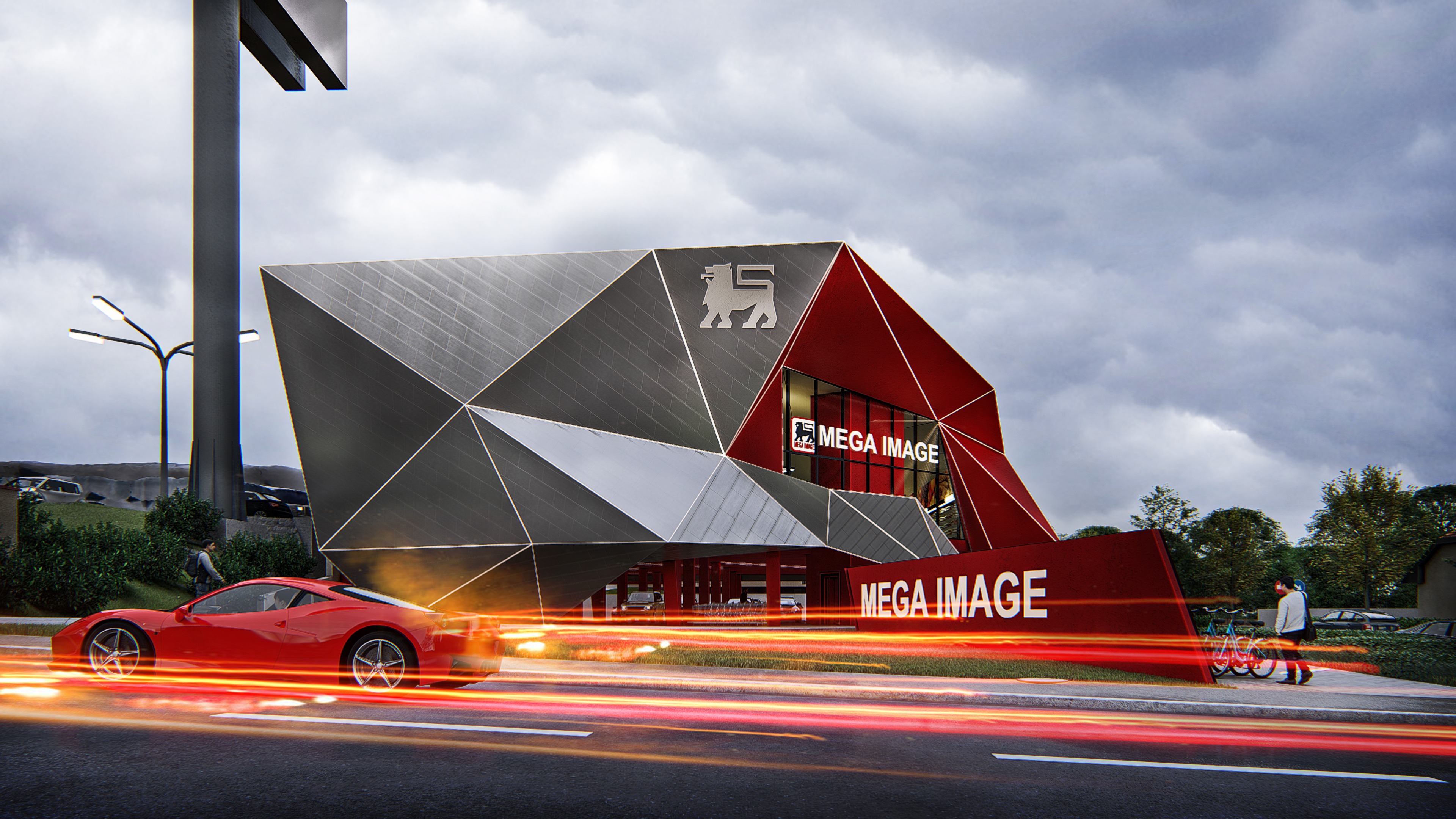 important preserve the existing geometry and the existing context exactly as provided do not modify alter reinterpret add remove scale or reshape any geometry do not change the site surroundings street layout neighboring buildings vegetation or context elements do not modify geometry scale proportions buildings road layout sidewalks or surrounding context in any way do not change text photorealistic architectural rendering clean and balanced contrast calm cinematic mood style contemporary european residential architecture minimalist premium understated do not alter the church color soft overcast noon atmosphere diffused natural daylight with subtle blue grey tones cinematic architectural mood large glass surfaces with realistic reflections soft mirror effect subtle environmental reflections of sky and surroundings wet pavement with smooth reflective surface soft light bounce and blurred reflections high dynamic range lighting realistic global illumination soft shadows calm and minimalist nordic mood photorealistic architectural visualization balanced exposure no harsh highlights add interior warm light do not modify text add motion blur to the cars do not add people in the foreground do not alter the white lines from the pavement do not alter the crosswalk do not alter the red