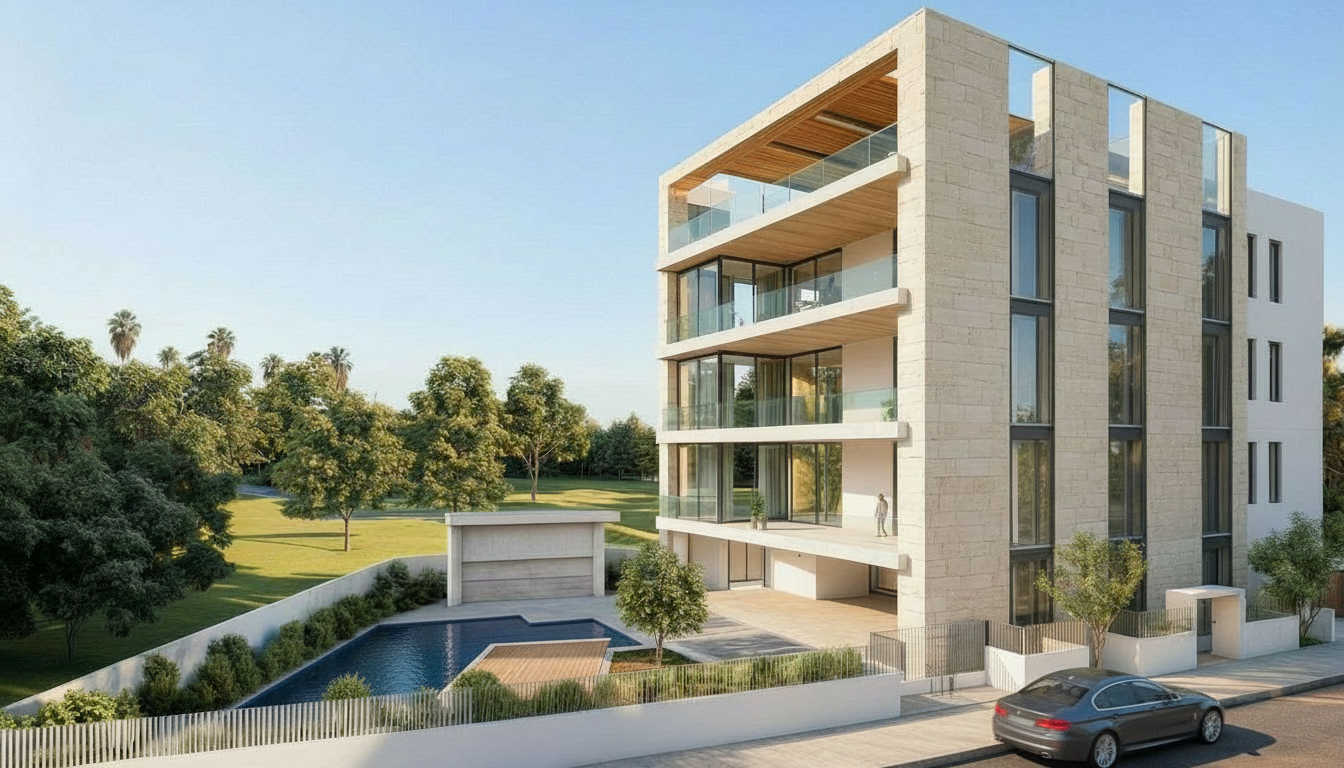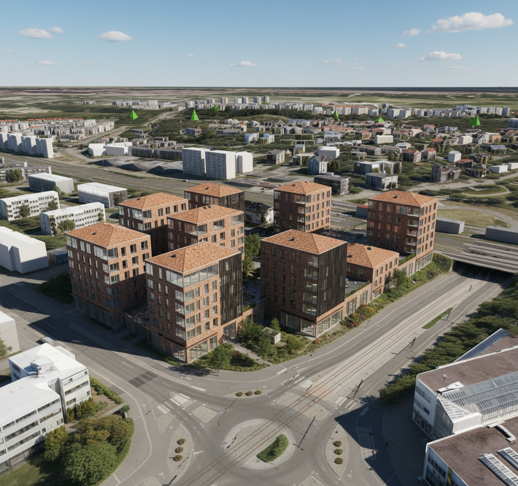 brown tile all the buildings modern buildings flat roof walking in between the buildings 8 floors modern windows