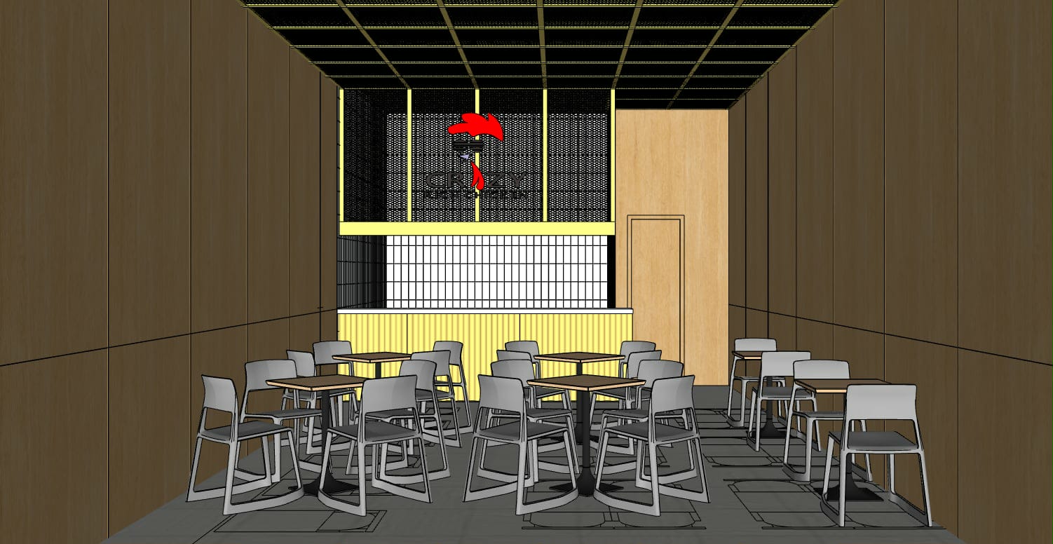 mesh wall and ceiling in bright yellow modern fast food fried chicken restaurant