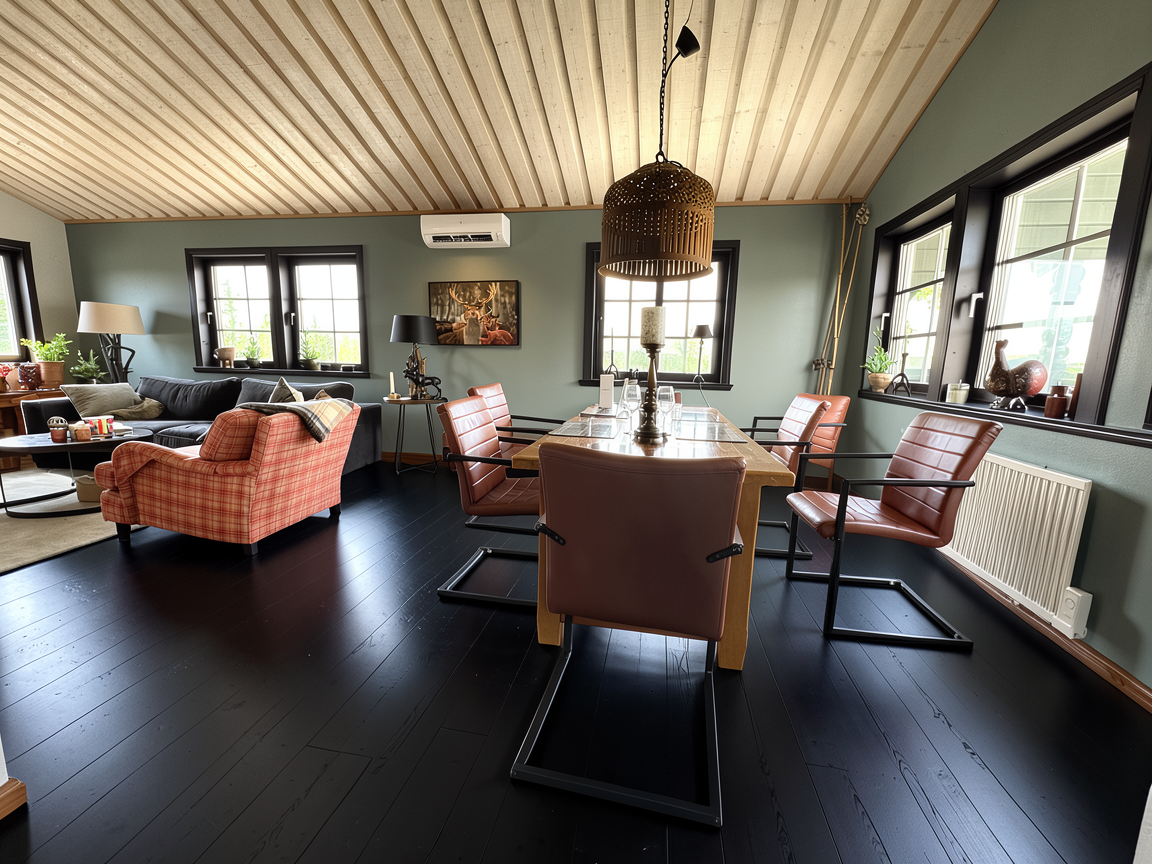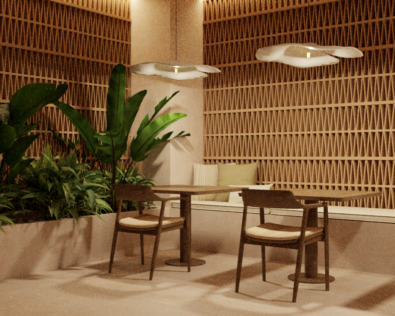 ultra realistic interior render editorial quality keep the exact composition camera angle and design do not modify layout or furniture goal transform the image into a high end editorial interior photograph removing cgi noise and improving realism especially in textiles and materials materials walls beige interior clay stucco smooth matte refined not rough not exterior lattice natural clay enhance depth joints and subtle imperfections wood natural walnut matte visible grain slight tonal variation floor sand tone porcelain large format rectified almost invisible joints textiles very important all fabrics must be natural linen textures slightly irregular subtle marbling jaspeado effect matte finish no synthetic shine visible weave at close range cushions and seats must show soft deformation and realistic tension natural folds no sharp or rigid edges lighting warm and unified color temperature across all luminaires soft realistic falloff no overexposed areas pendant lamps paper like texture papier m ch feel softly translucent visible warm filament subtle glow vegetation more realistic leaves variation in tone slight translucency light reflection avoid plastic or overly saturated look geometry slightly rounded edges on walls furniture and lattice avoid sharp cgi edges realism remove grain noise completely add subtle imperfections and micro variations in all materials improve contact shadows and ambient occlusion avoid overly perfect or artificial surfaces final look warm tactile mediterranean inspired editorial interior photography natural calm highly realistic no cgi feeling