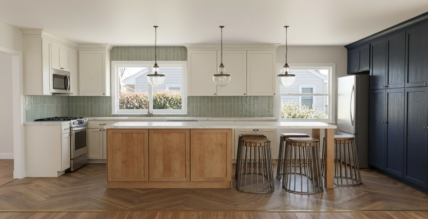 convert this architectural rendering into a highly realistic editorial style luxury outdoor photograph suitable for marketing and listing imagery maintain the exact architecture layout geometry porch structure ceiling design openings and proportions exactly as modeled do not redesign restyle or modify the architecture in any way do not move walls columns windows doors or built in elements enhance realism only through natural lighting accurate material texture subtle reflections and soft shadow depth the final result should feel like a professionally photographed architectural digest style exterior used for luxury real estate marketing materials in the space include tilebar 12x24 black slate tile flooring in a herringbone pattern hardie siding painted sherwin williams pure white roof gaf timberline shingles in charcoal color soffits and fascia painted sherwin williams origami white gutters and downspouts in charcoal finish fluted wood ceiling cladding the black slate tile should appear natural matte and slightly textured with subtle tonal variation and realistic grout lines the herringbone pattern should read clearly with correct scale and alignment the hardie siding should appear clean and refined with a smooth painted finish showing subtle shadow lines at joints and realistic exterior depth the roof shingles should appear textured and dimensional with natural variation consistent with charcoal architectural shingles the soffits and fascia in origami white should appear soft and clean with subtle tonal depth the gutters and downspouts should appear matte charcoal with realistic metal finish and clean edges the fluted wood ceiling should show realistic wood grain depth and shadow between flutes with a warm natural tone do not add or modify any furniture if furniture is present keep it minimal and secondary to the architecture without adding new elements the outdoor space should feel elevated calm and refined with a strong connection between the porch and yard lighting should include soft natural daylight with gentle exterior shadows and realistic light falloff the lighting should feel balanced and editorial not harsh or overly dramatic the final image should appear crisp photorealistic and editorial similar to a professionally photographed luxury exterior avoid warped or exaggerated wide angle distortion the perspective should feel natural as if captured by a professional architectural photographer with straight vertical lines and balanced proportions do not alter architecture layout geometry or materials only enhance realism