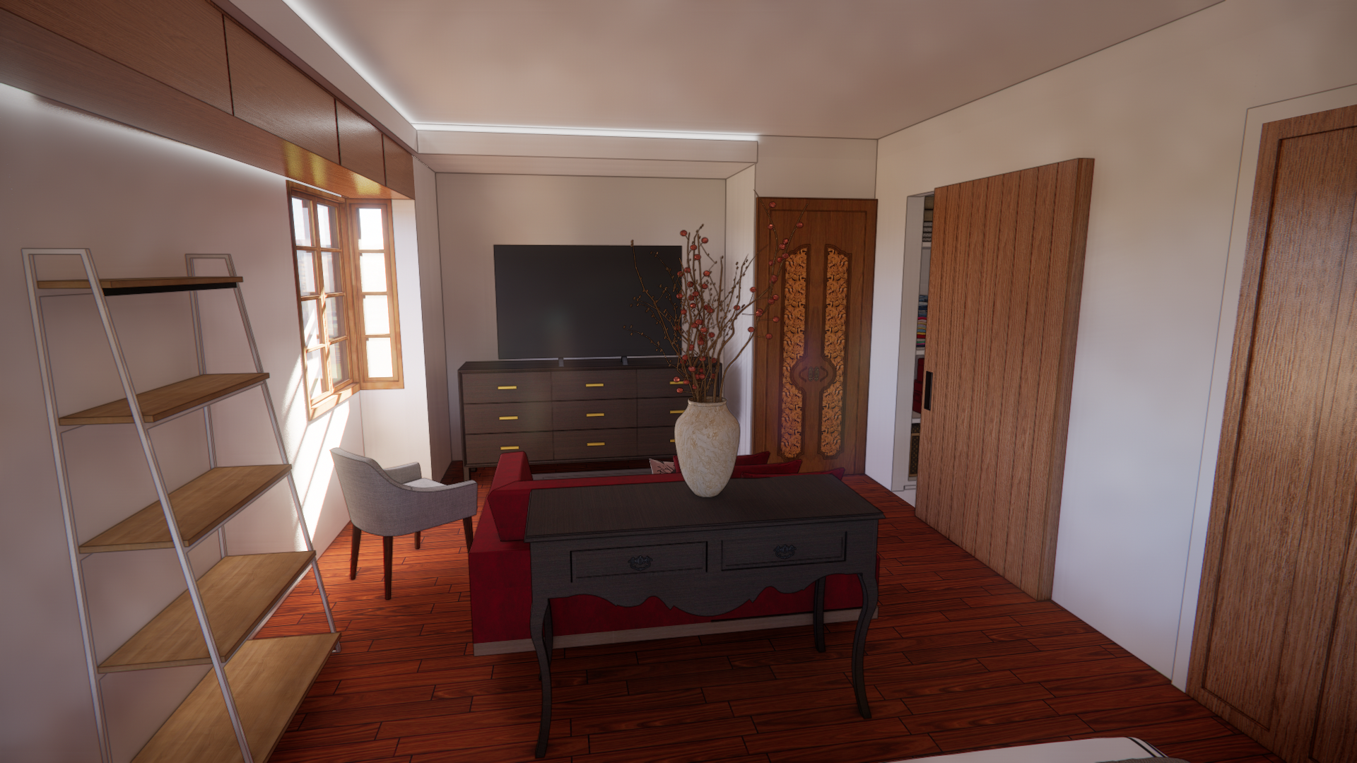 render a cozy and modern living room with a minimalist aesthetic the floor is a rich mahogany wood giving warmth to the room the bed has crisp white linens with subtle geometric black accents a gray bed runner adds a touch of elegance the cabinetry and window frames are a light natural wood harmonizing with the floor light gray roman blinds cover the windows allowing soft natural light to fill the space creating a calm and inviting atmosphere the bench by the window is a neutral beige complemented by accent pillows in muted earth tones and a splash of red and orange for contrast led lights create a soft ambient glow around the ceiling and shelving areas enhancing the serene environment