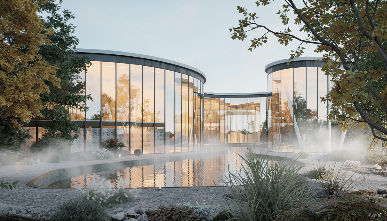 render a beautifully designed modern office interior with an open floor layout use warm wooden floors and tables in a rich brown tones and the window frames in deep black for contrast include stylish beige and brown chairs around the tables add green potted plants for a touch of nature the lighting should be soft and ambient creating a warm inviting atmosphere incorporate subtle decorative elements and ensure the space feels spacious and airy