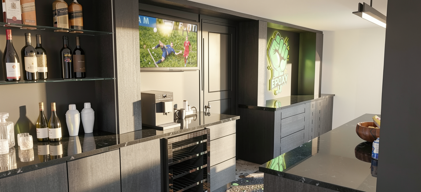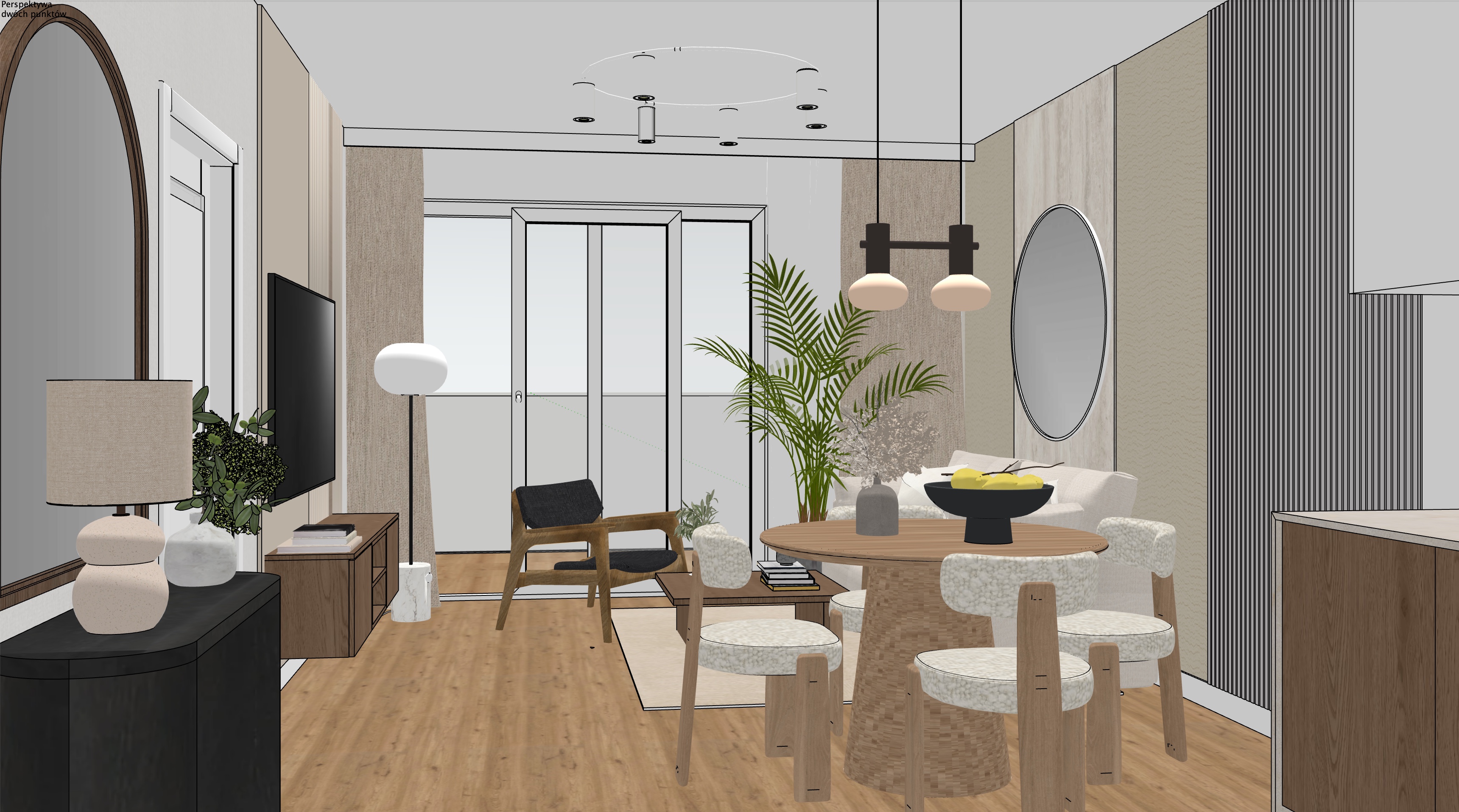 photorealistic interior visualization of a cozy elegant living room with soft beige and warm tones large floor to ceiling windows opening to a balcony with a modern glass railing outside a beautiful natural view with trees in the foreground and a lake visible farther in the distance not directly next to the building bright yet soft daylight calm and inviting atmosphere refined contemporary design high end materials subtle textures stylish furniture natural fabrics wooden accents realistic proportions ultra detailed cinematic light realistic shadows premium interior magazine style