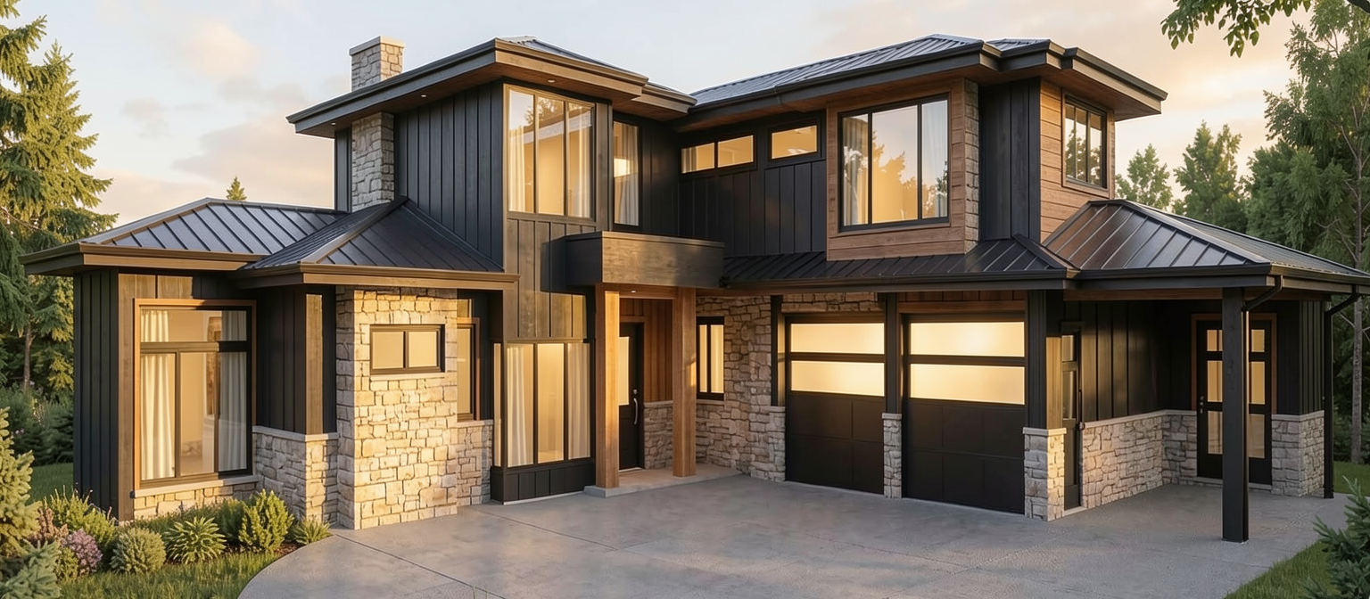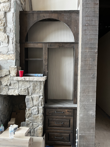 do not change the cabinets in any way preserve the exact cabinet colors materials finishes dimensions door and drawer styles hardware spacing alignment and all geometry exactly as shown do not alter the countertop shape backsplash appliances flooring lighting fixtures or wall structure only remove the construction materials clutter and mess from the scene clean the room and make it look finished and staged add a few simple tasteful home accessories appropriate for the style of the space but do not add or remove any furniture windows or architectural elements maintain the original lighting direction and realism enhance clarity and polish the photo while keeping the cabinetry and room design completely unchanged do not alter the lighting to keep the cabinet colors as they are in the image change the countertop on the base cabinet to be black turn the fireplace on add a light in the top of the arch stage the open shelving for a mountain modern living room