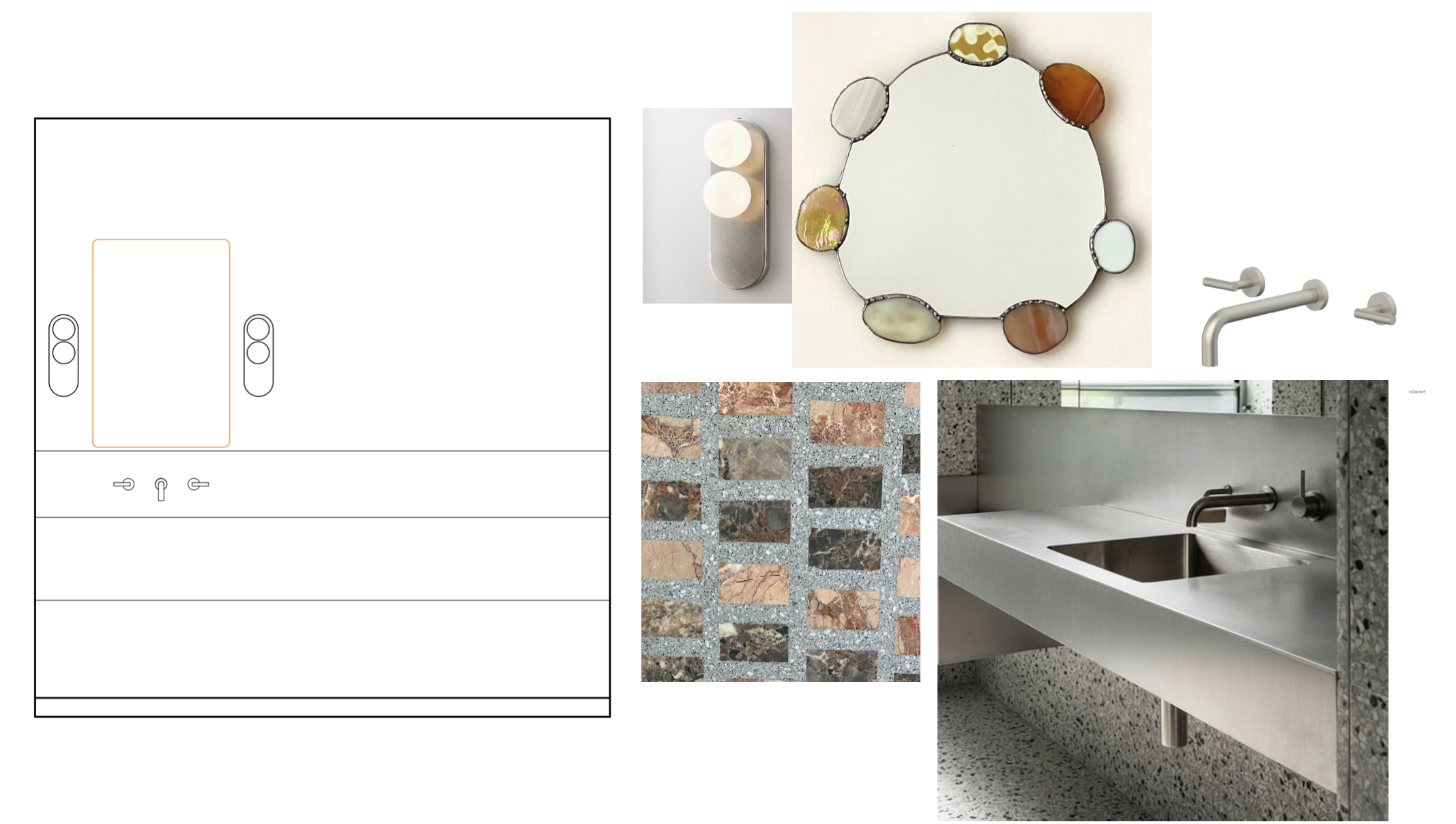 modern organic powder room with floating stainless steel sink and 12 backsplash use inspo picture as the style but use the interior elevation and do not change sink and fixutres are off to the left in the elevation do not show p trap floor is colorful mosiac in gray grout as shown faucet is burnished nickel as shown use mirror from the image not rectangle with the same sconce on each side of the mirror as shown walls are a beige limewash no windows in the room
