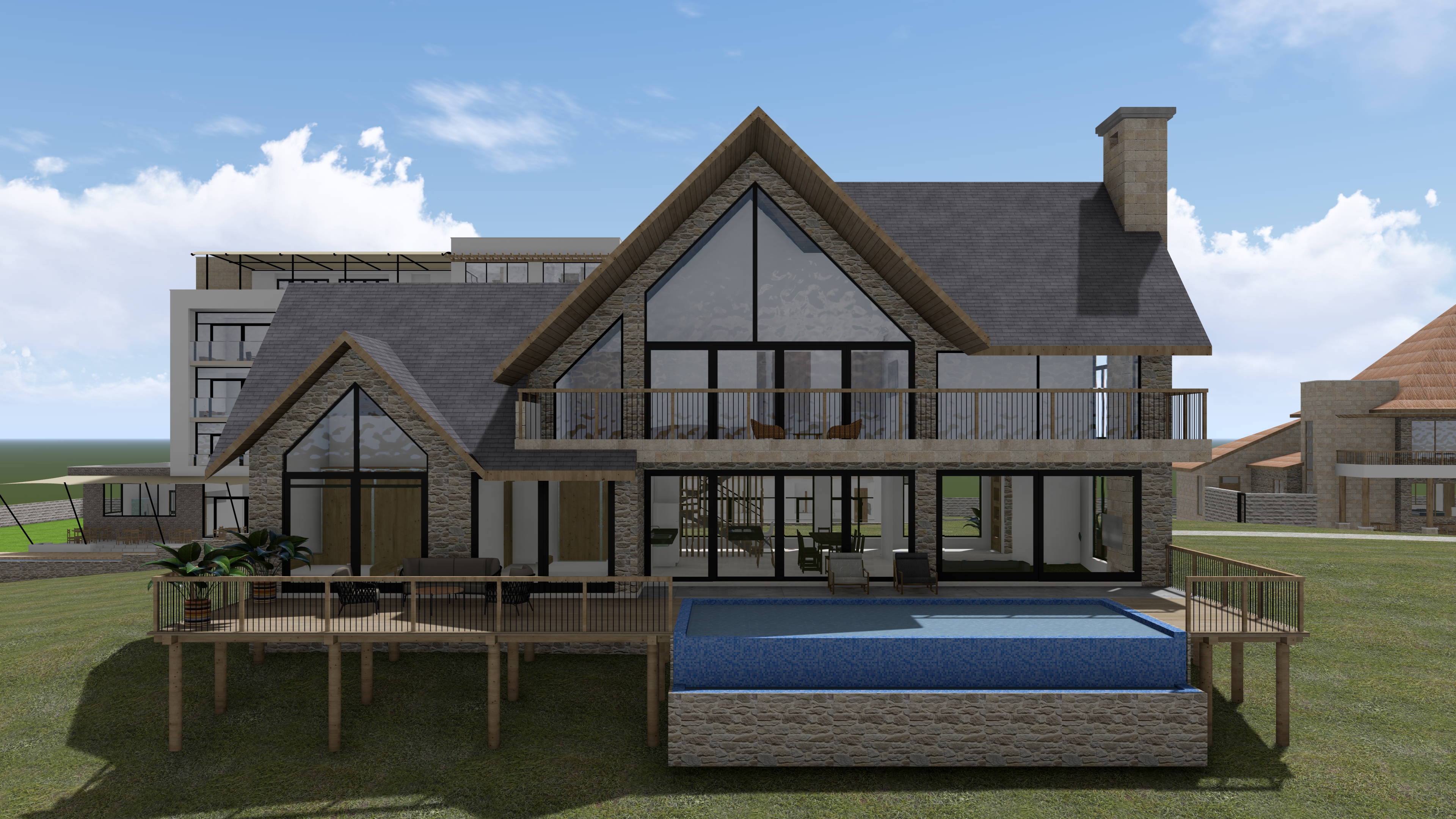 this is a model of a house add few trees in background for context add vegetation with some floral ones