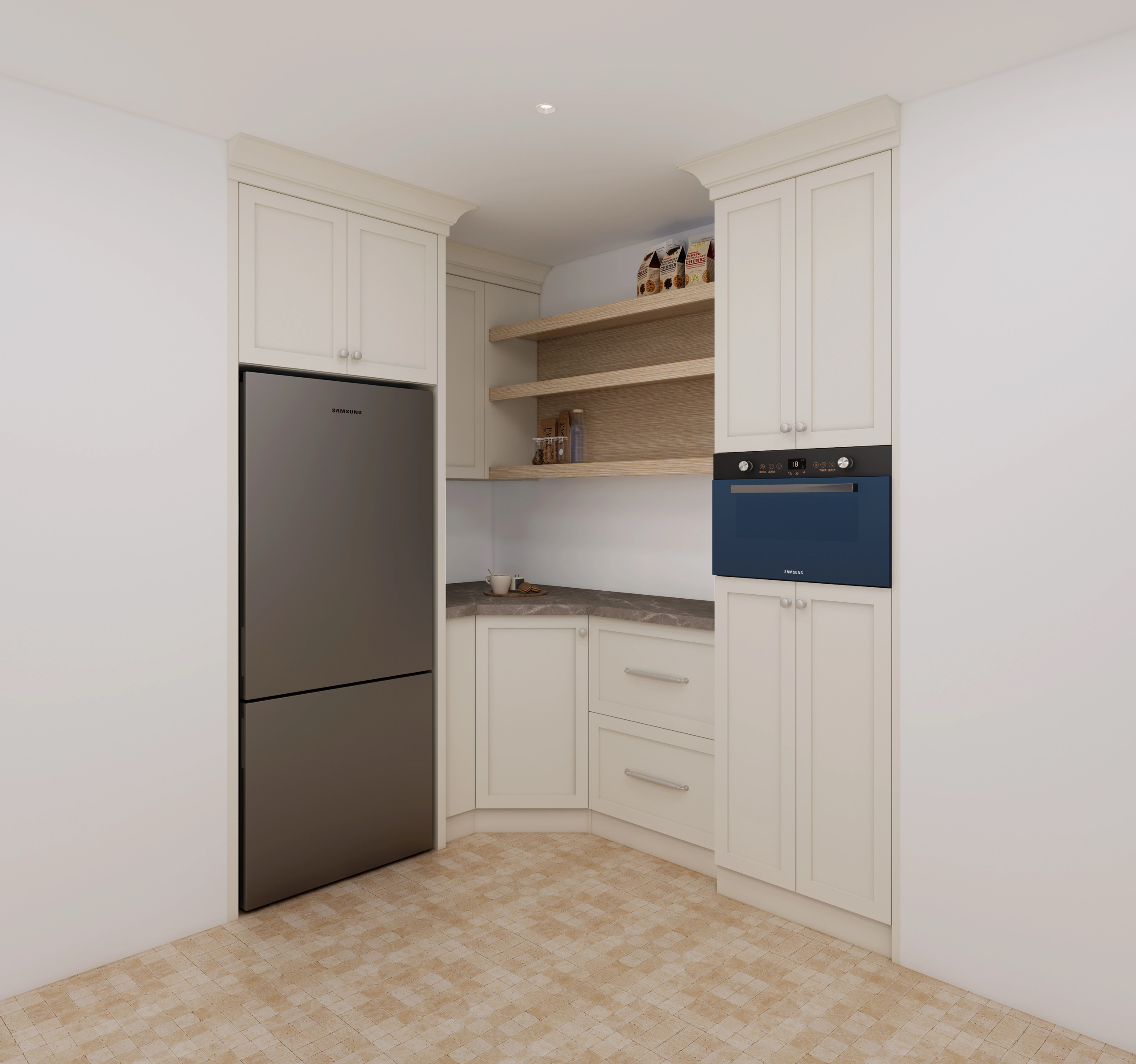 make this pantry have cabinets in the colors ral 9010 please make the countertop and backsplash a medium toned grey quartzite and the floors a french lay medium grey slate add under cabinet lighting to the open shelves in 2700k