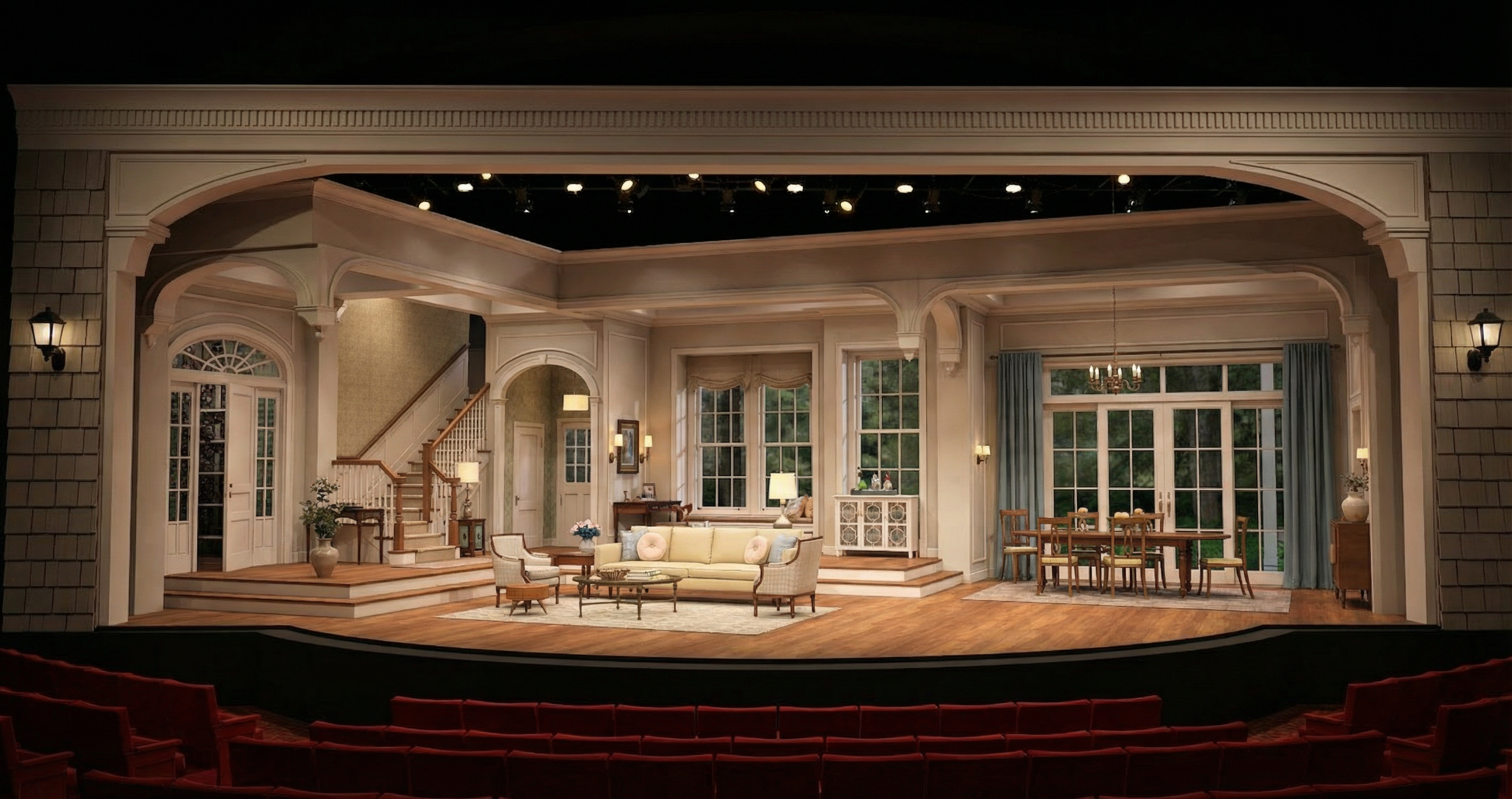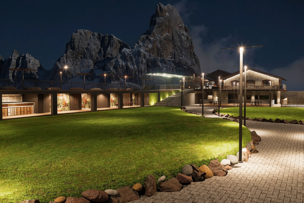 use this image as the base ground modification remove all stones and rock borders that currently separate the grass areas from the paved paths eliminate the raised lawn areas and any visible height differences lower the grass level so that the entire ground surface matches the elevation of the existing brick paving surface result replace all grass areas with the same brick paving material as the existing walkway extend the paving continuously across the entire open area creating one large flat plaza the final surface must be uniform level and continuous with no steps slopes edges or borders preserve buildings and terraces staircases and railings lighting poles and night lighting atmosphere background mountains and sky camera position and perspective photorealistic night rendering consistent lighting and shadows minimal intervention modify only ground levels and surface material