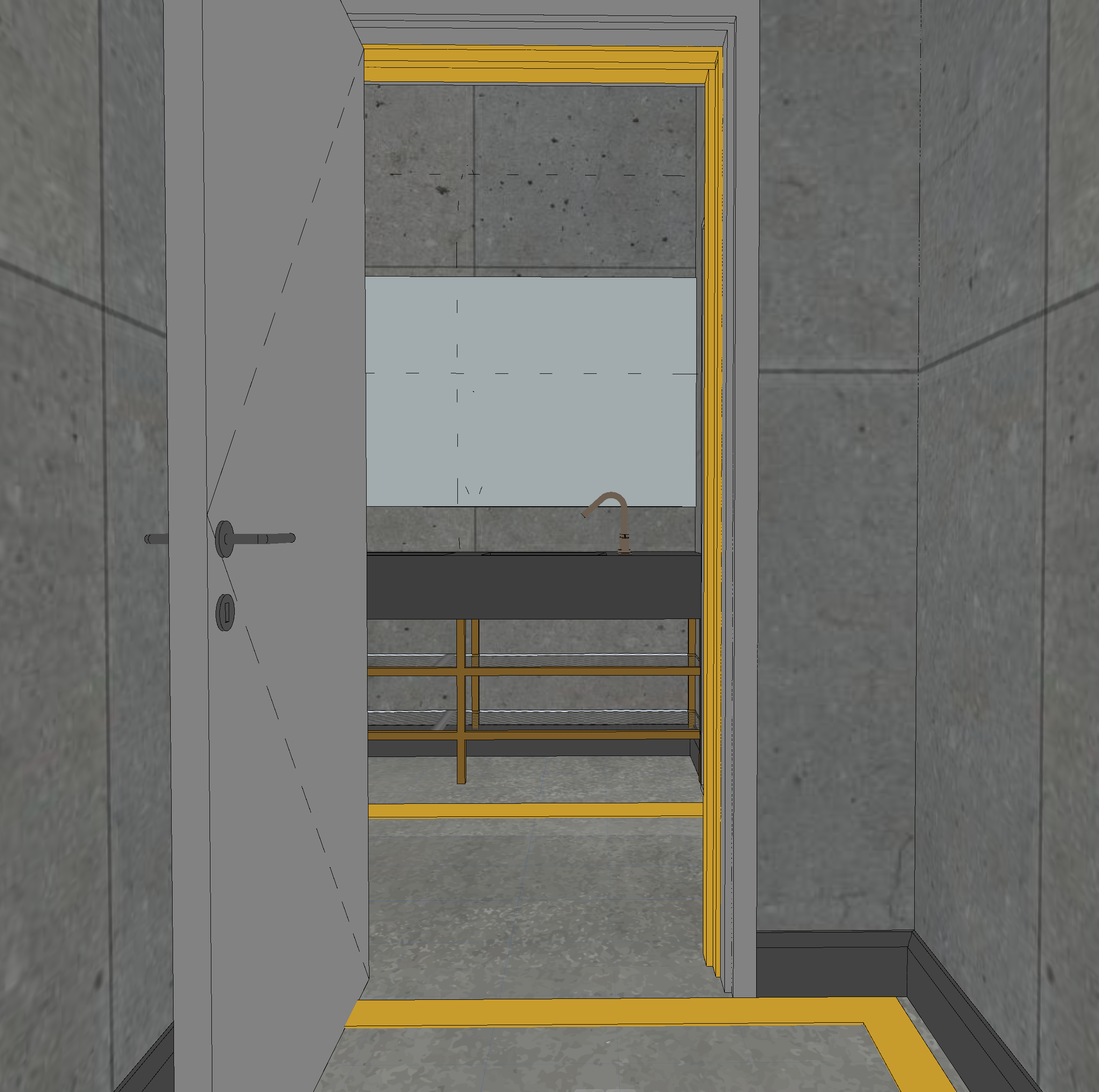 ultra realistic architectural render of an industrial public restroom interior viewed from inside a stall looking outward toward the sink area the camera is positioned at eye level inside the stall the stall walls are finished in large raw concrete panels with subtle formwork texture including the wall behind the toilet the floor is polished concrete and along the base of the walls runs a continuous safety warning stripe in black and yellow marking the perimeter of the space and along the corridor a bright safety yellow exposed vertical pipe runs upward toward the ceiling as an industrial decorative element can be seen in the mirror on the left side a heavy concrete industrial sink unit with exposed plumbing and a yellow metal support frame large rectangular mirrors above the sink with soft perimeter backlighting integrated behind the mirrors creating an indirect glow on the wall above the sink is a large rectangular mirror mounted on the brick wall materials should feel authentic raw concrete panels painted brick masonry powder coated metal frames exposed safety yellow pipes brushed metal sink fixtures polished concrete flooring style contemporary industrial brutalist public restroom design minimal and clean rendering style high end architectural visualization photorealistic materials global illumination subtle ambient occlusion realistic reflections in the mirror hdr lighting important constraints preserve the industrial architecture style avoid adding extra elements or altering the layout