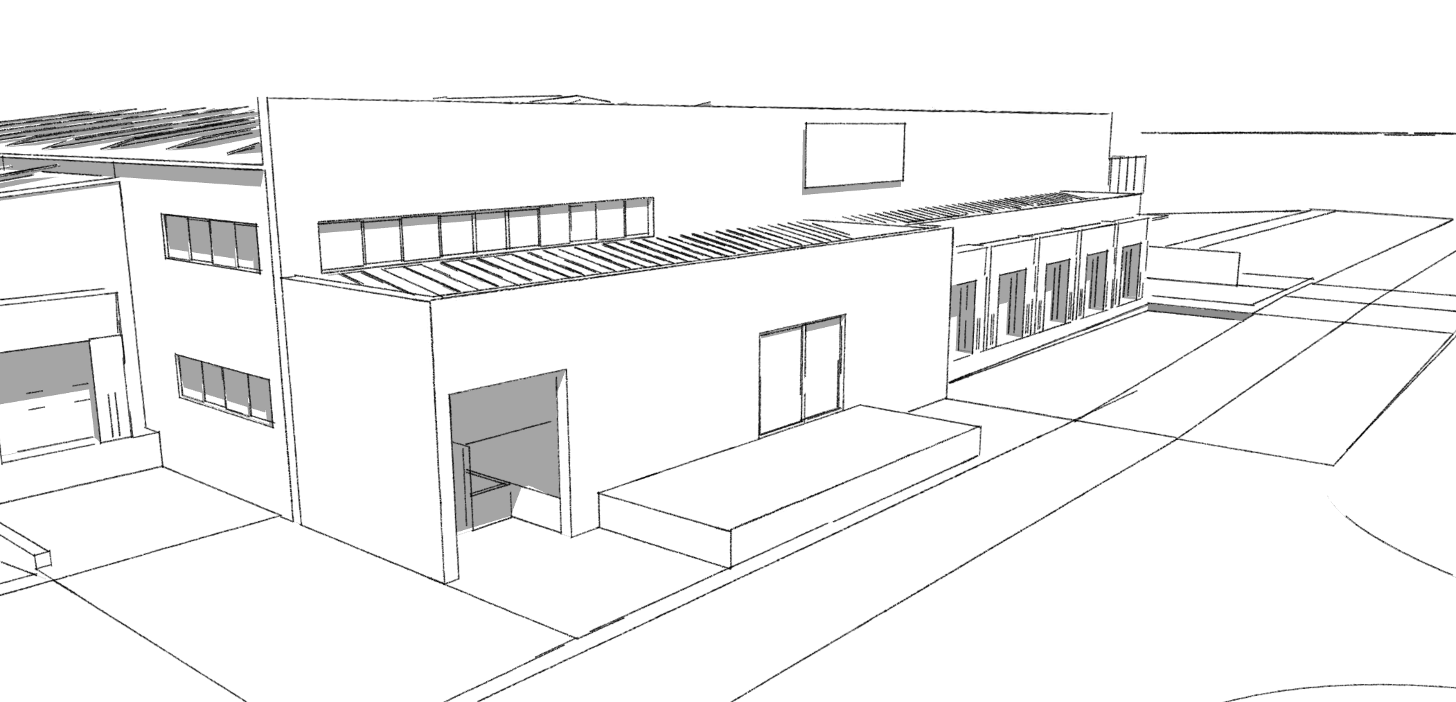 modern industrial building with a clean minimalist design grey metal composite panels on the fa ade large reflective blue tinted glass curtain wall at the main entrance and sharp geometric volumes forming a cantilevered upper block long side elevation with continuous opaque white cladding and a distinctive window band clear precise edges and monolithic appearance bright daytime sky with soft shadows maintain the perspective geometry scale and proportions of the original reference photo high realism but sketched architectural rendering style