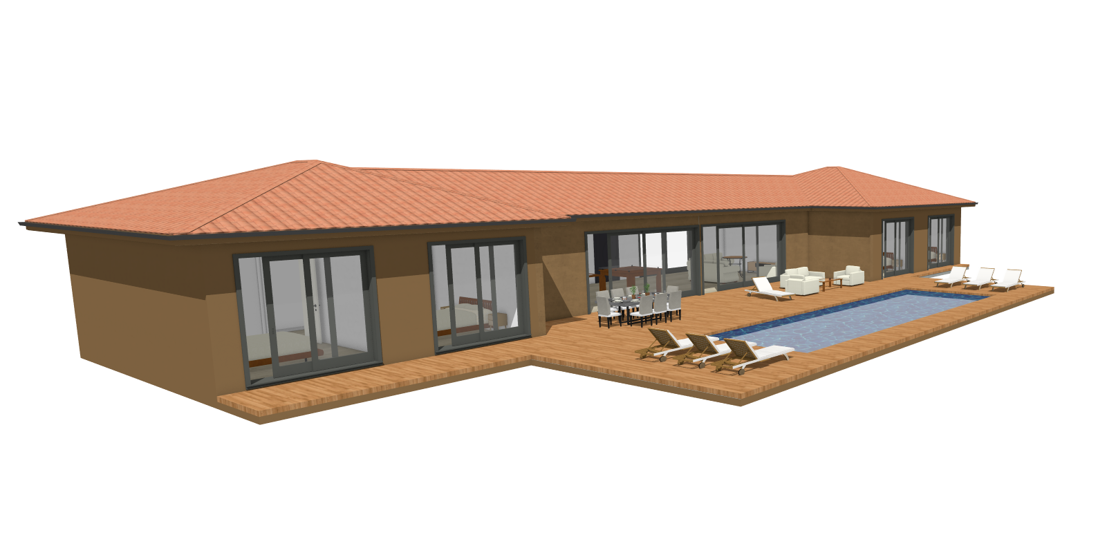 exterior shot a luxurious modern house with a terracotta roof earthy brown walls and expansive glass doors add a wooden deck in warm oak tones surrounding a sparkling blue rectangular pool place elegant white outdoor furniture including sun loungers and a dining set create a serene atmosphere with soft ambient lighting suggesting a warm afternoon under a clear blue sky lush green plants in the background add a touch of nature