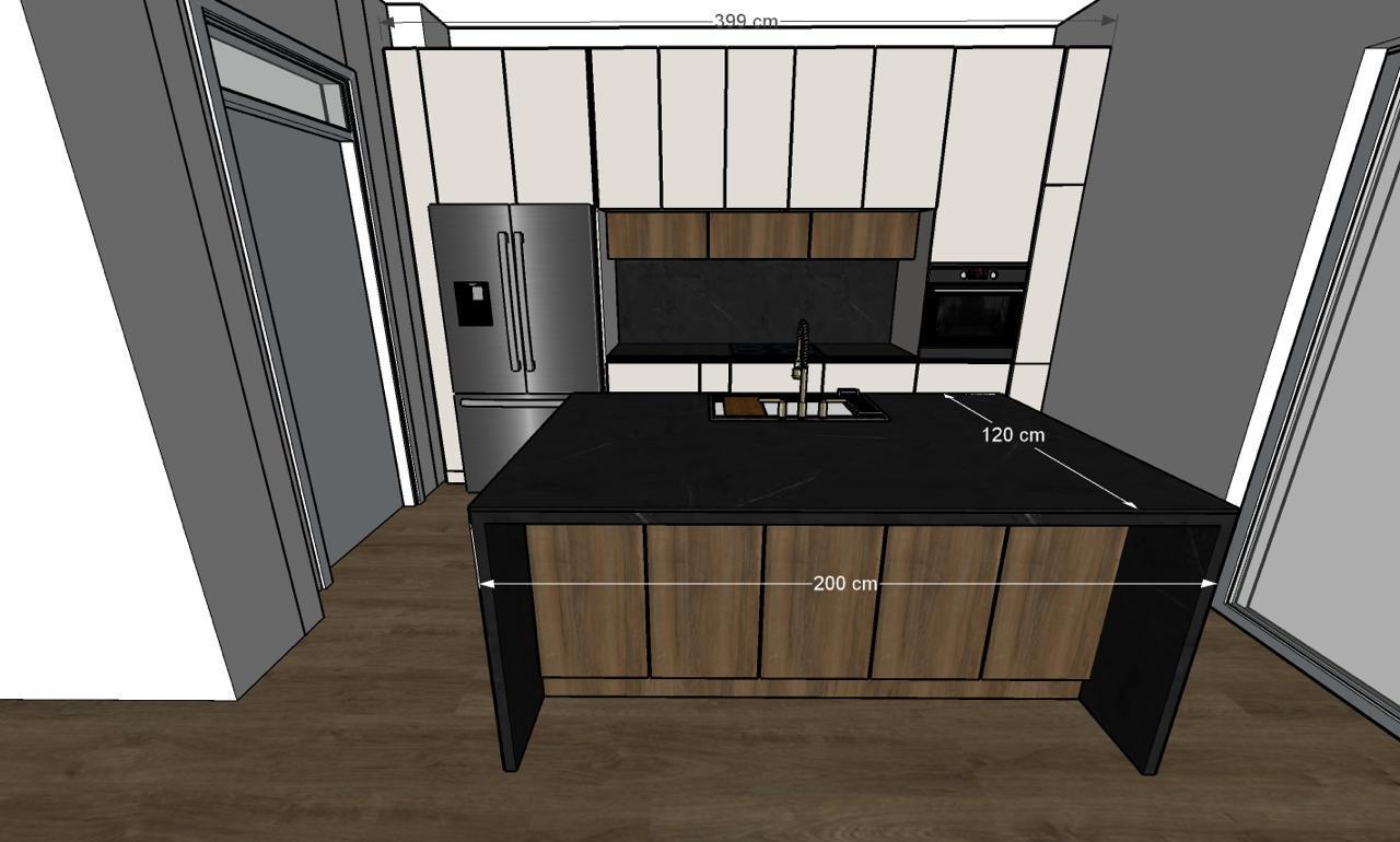 turn this kitchen sketch into a realistic high end interior render while keeping the exact same kitchen layout cabinet arrangement island proportions appliance positions perspective and overall design do not redesign anything remove all dimensions measurement text arrows guide lines and technical annotation lines from the image completely so the final result looks like a clean realistic render not a technical drawing keep the materials as shown in the sketch tall cabinetry in soft warm cr me finish upper cabinets in cr me island front and selected wood cabinet areas in warm natural wood veneer countertop waterfall island sides and backsplash in dark black stone black sink and black faucet stainless steel refrigerator dark floor make it look like a realistic modern luxury kitchen render with clean lighting realistic materials proper shadows and sharp details important remove only the dimensions and drawing markings keep the exact kitchen design unchanged negative prompt restriction no measurement text no dimension lines no arrows no technical annotations no redesign no layout change no camera change