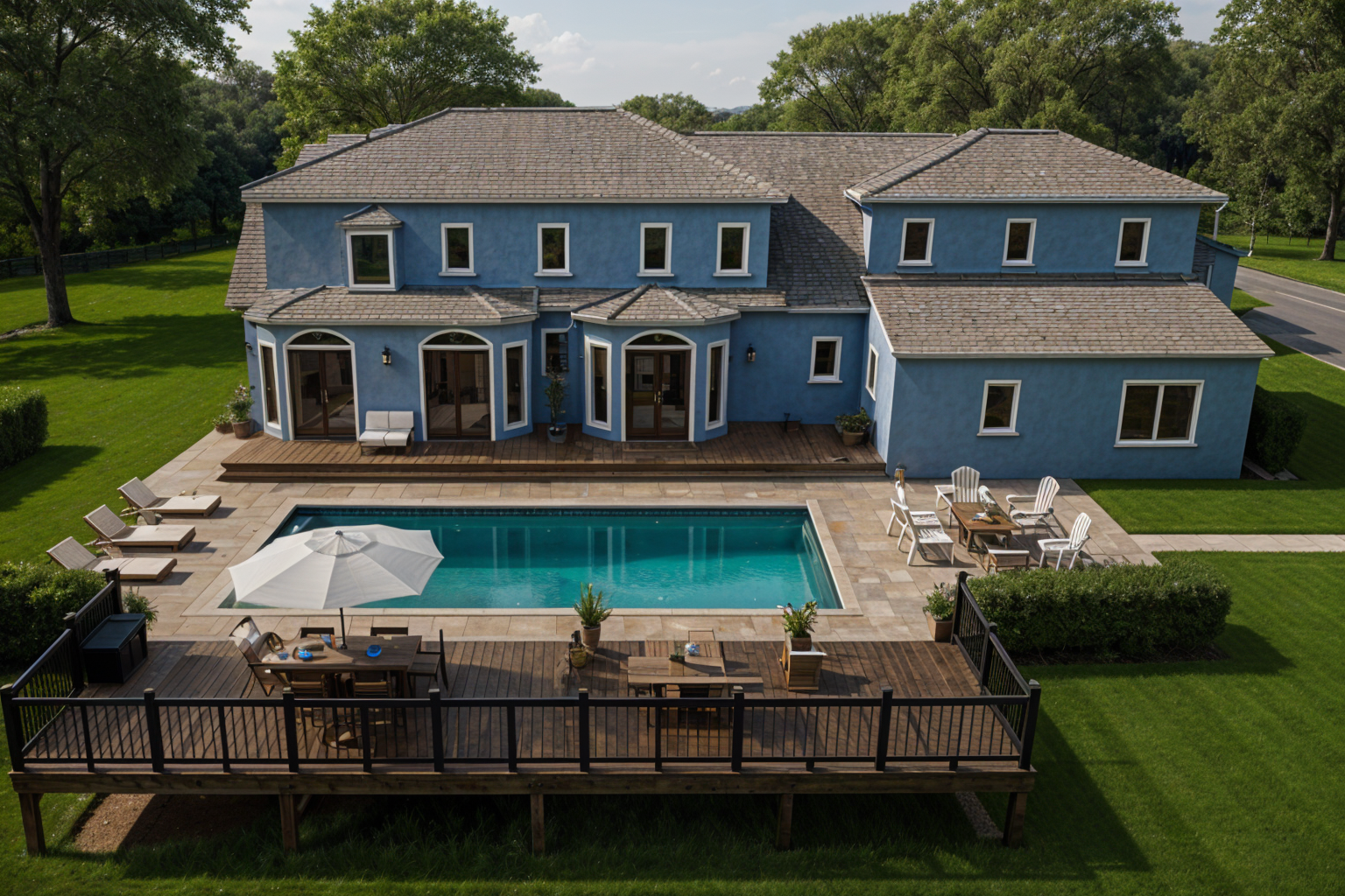 generate a beautiful suburban street scene featuring modern craftsman style houses with beige stucco walls and gray shingle roofs each home should be in the same style with slightly different wall colors the atmosphere should be serene and inviting with a bright blue sky filled with soft fluffy clouds include lush green trees lining the street casting gentle shadows the road should be a rich smooth dark gray while the sidewalks are a clean light gray add warm natural sunlight to create a tranquil and welcoming neighborhood ambiance