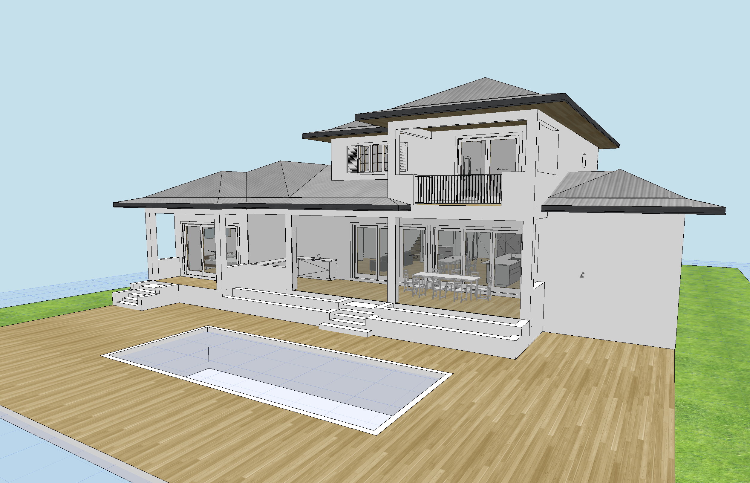 please render this to look photorealistic add some small florida plants in the staggered long liner planters do not add additional planters
