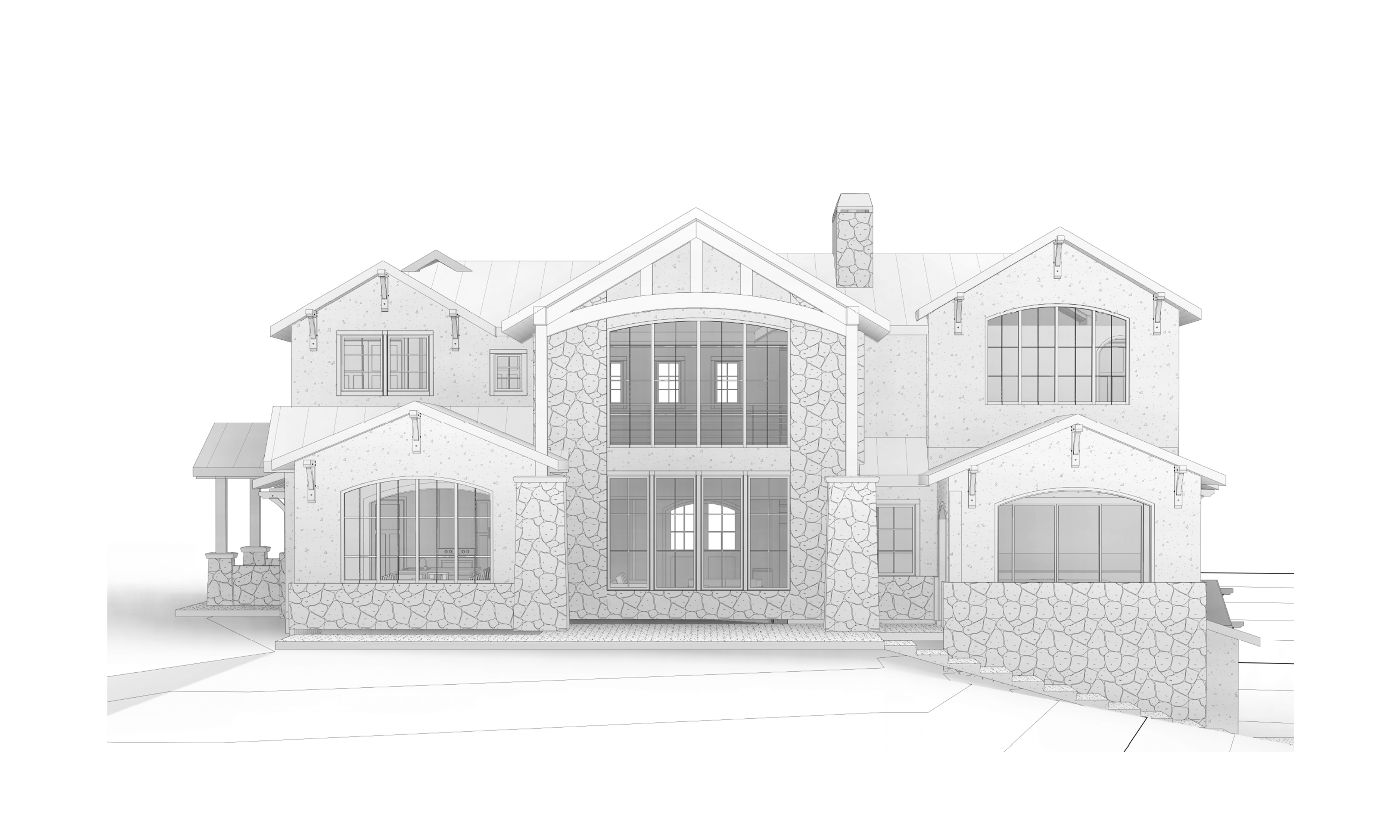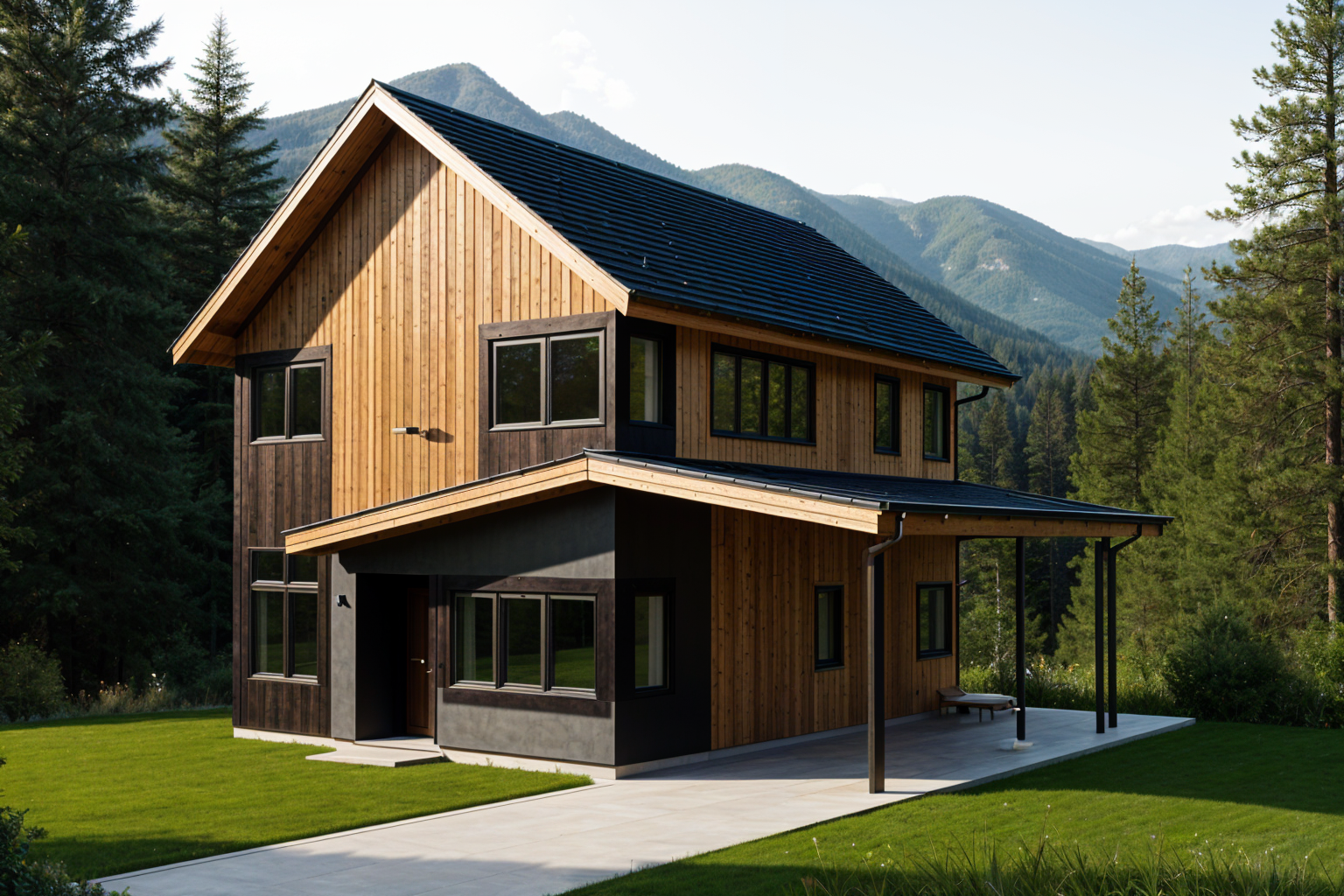 photorealistic rendering of a luxury old world european architecture home use a mix of natural irregular rustic stone on the lower level and vertical sections with warm but dark rustic old world stucco siding and heavy exposed dark stained timber beams and brackets at gables and entries roof is multi gabled with weathered cedar shake shingles emphasize the tall central window with black metal grid framing and a warm glowing interior with all windows emitting soft golden light include a covered timber framed entry with stone columns arched detailing and wood door plus warm exterior lantern sconces add a right side covered patio with seating and a lit fireplace and carriage style wood garage doors integrated into the stone base set on a sloped mountain site with natural boulders low shrubs golden hour lighting with beautiful vibrant sky and subtle ground lighting surrounded by dense evergreen forest cinematic and warm ultra realistic architectural visualization uplighting exterior lighting