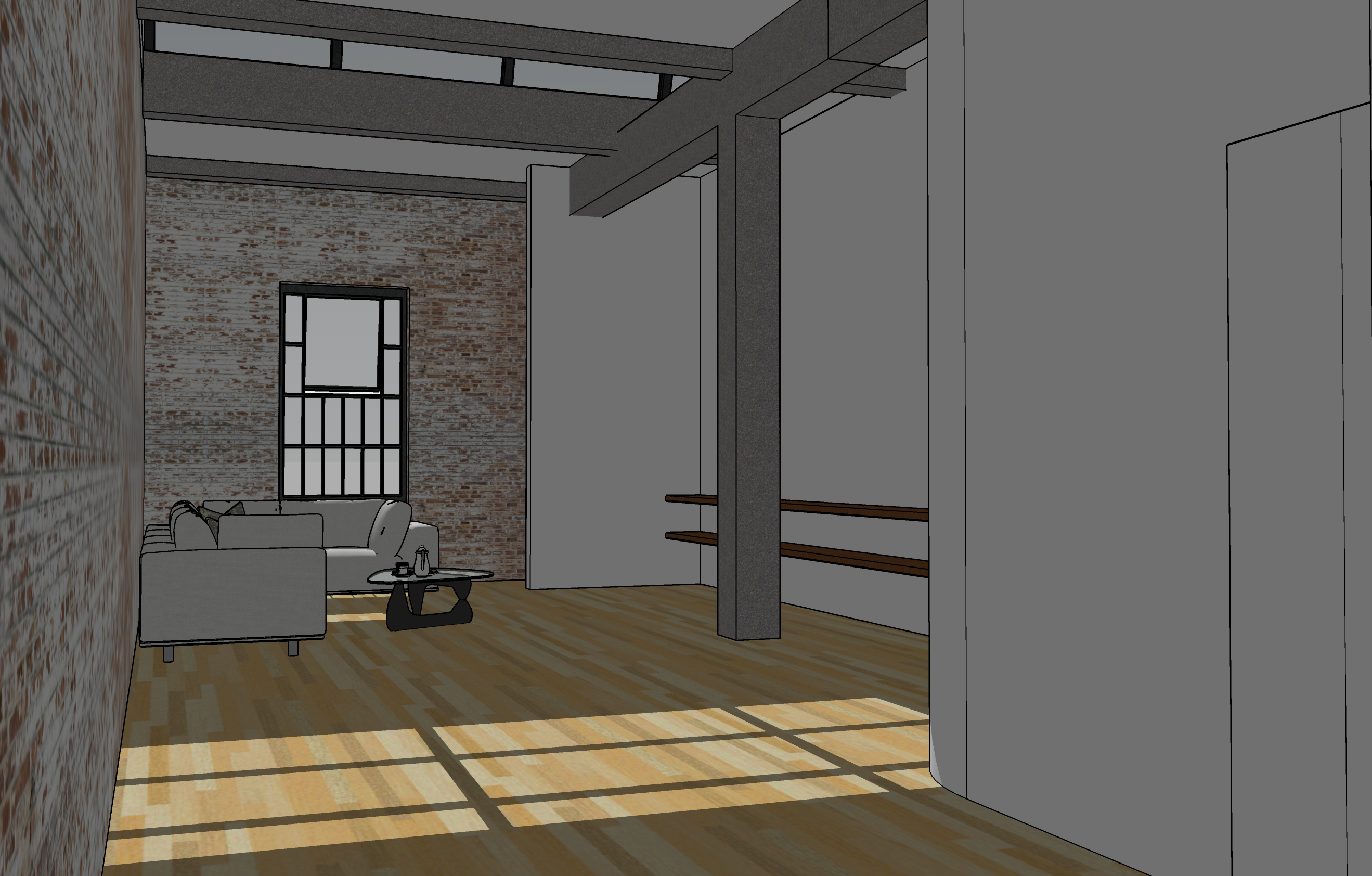 render this image to make it look real the view out the window should be a of brooklyn rooftops