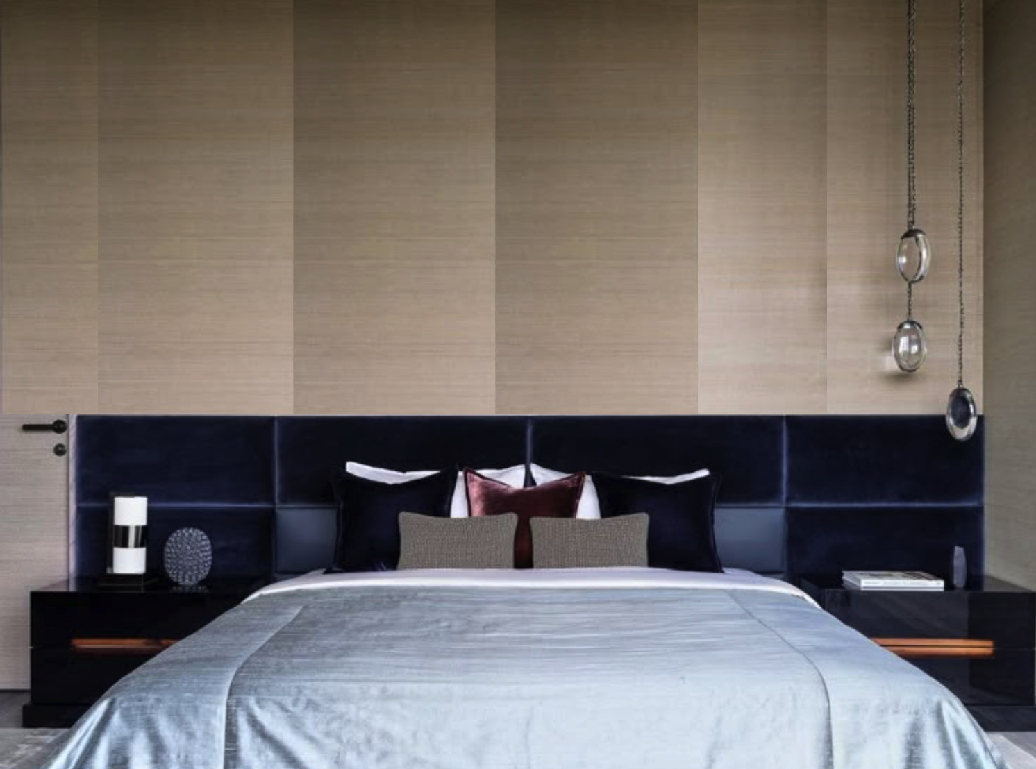 interior shot transform bedroom wall concept to neutral wall paper with bed in a wine red color keeping same headboard design