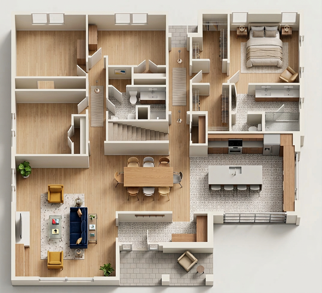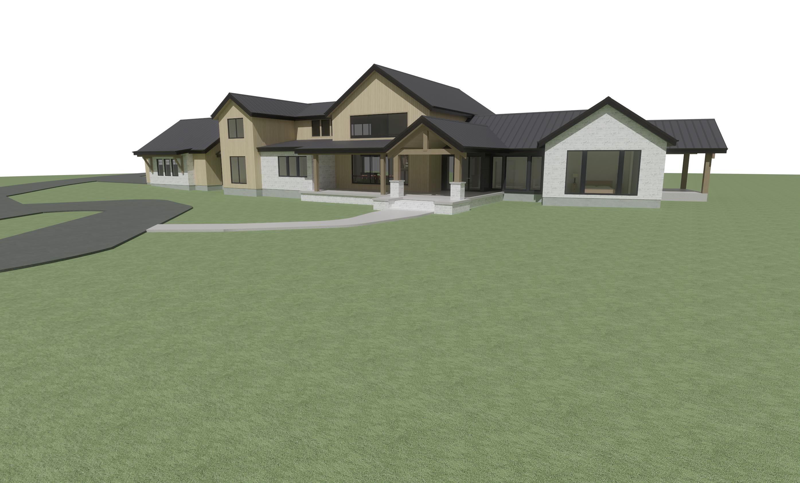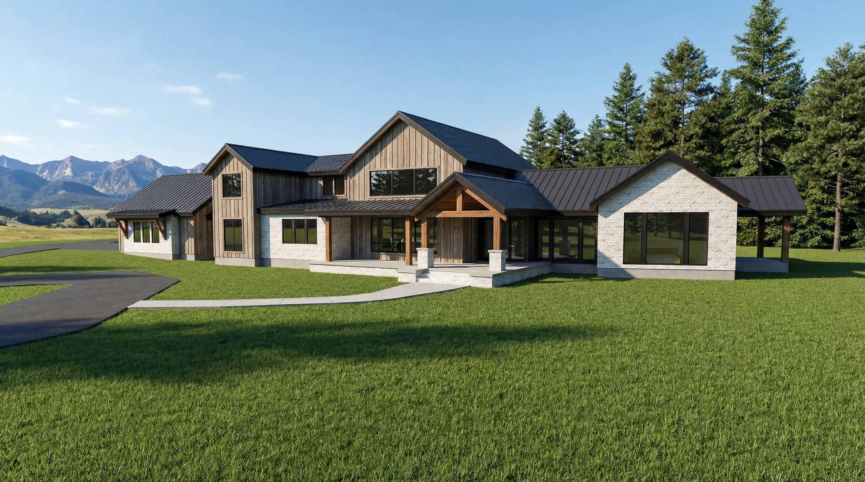 enhance the realism of the existing architectural design while maintaining the same materials and textures focus on realistic lighting shadows and surface details to create a lifelike appearance ensure the mixture of lap siding and board and batten is preserved in the correct areas making them look authentic and cohesive this is in montana add montana landscape dont change the shape of the driveway do pine trees to the right and behind house to the left add mountains far off in distance add montana vegetation around house