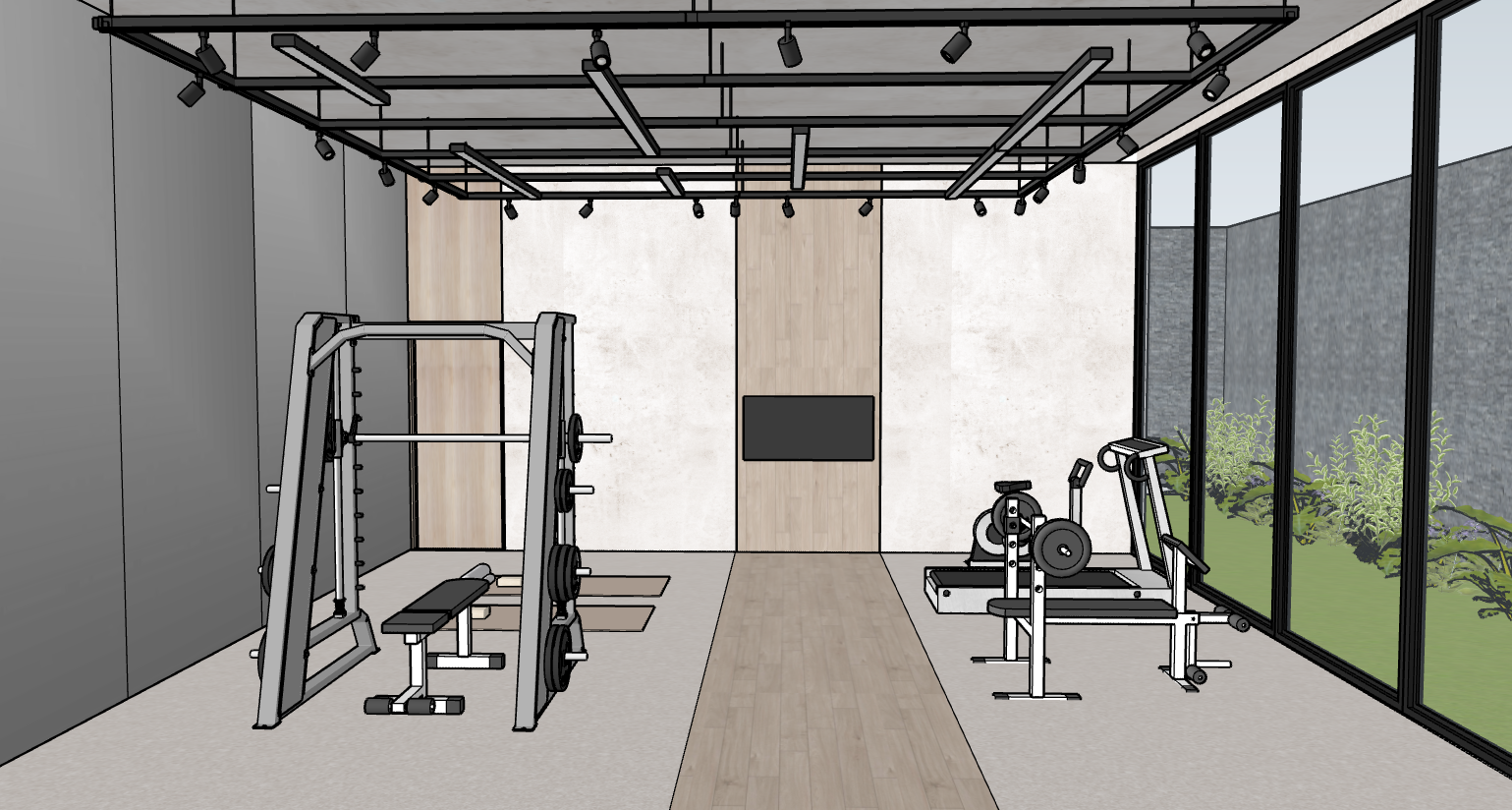 the left wall is all mirror render a modern gym interior filled with exercise equipment highlight the sleek minimalist design featuring light gray walls and a polished concrete floor the ceiling should be industrial with exposed black beams and stylish track lighting include a large glass window wall on the right side letting in natural light and offering a view of lush green plants against a textured gray wall outside the gym equipment should be primarily metallic with accents of black and dark gray create a serene and modern atmosphere with a subtle color palette and sophisticated design elements