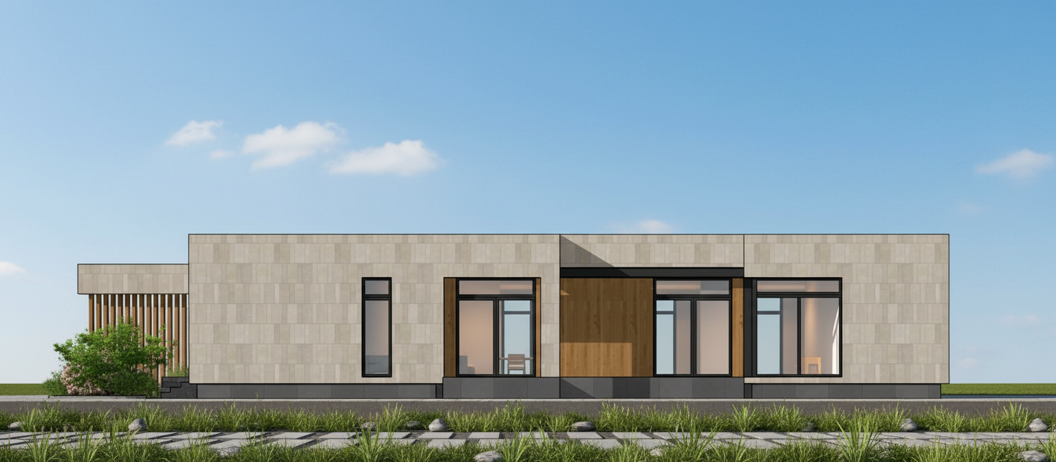 replace only the wooden cladding with a photorealistic slatted wood texture use vertical narrow wooden slats with natural tone variations and visible grain keep the existing stone wall texture from the photo exactly as it is without any alteration ensure high resolution realism architectural rendering quality and seamless integration with the building perspective and lighting use a neutral minimal background to avoid distractions