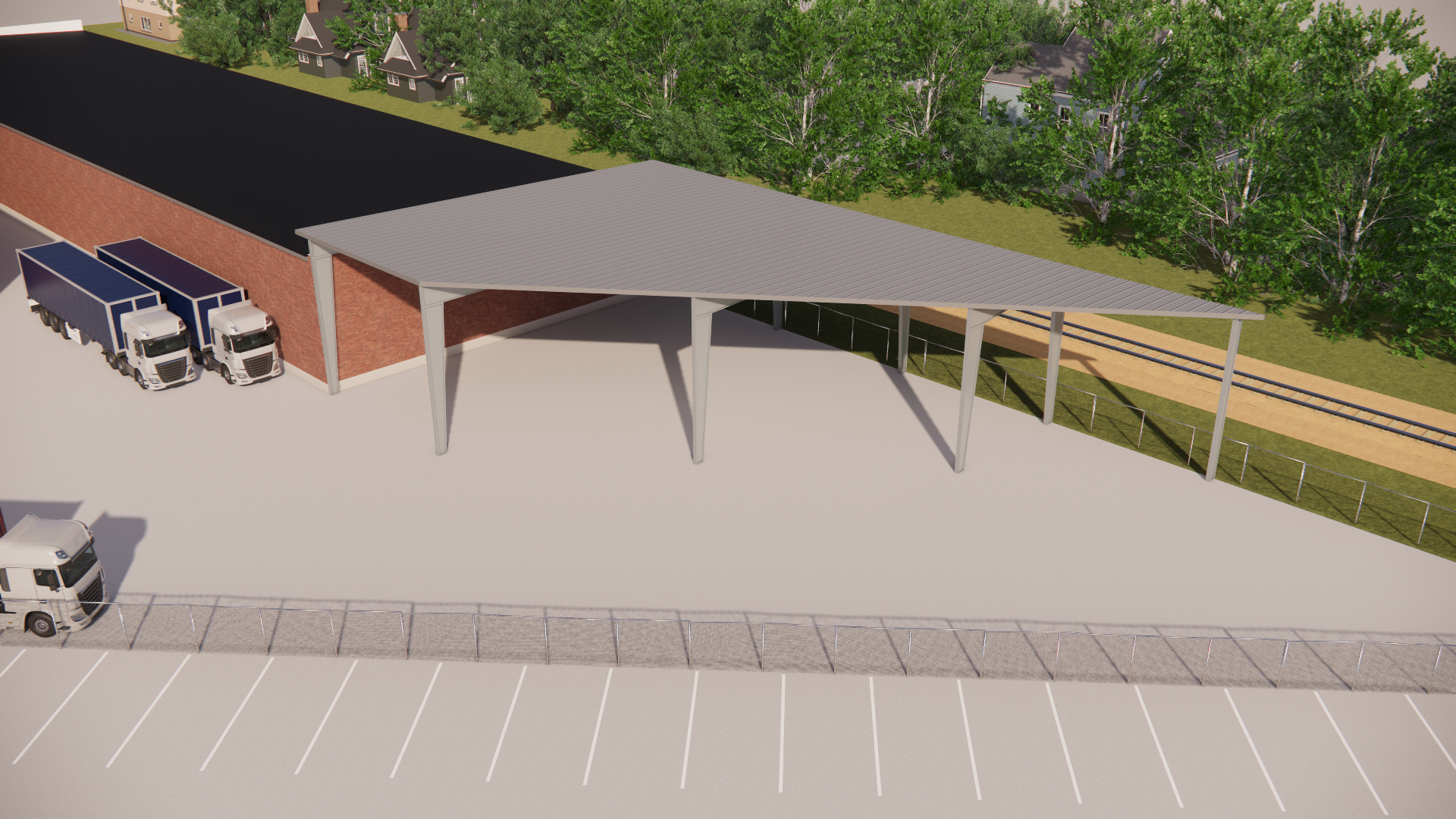 steel canopy structure brick building concrete lot with chain link fence galvanized aluminum architectural steel roof on the canopy black rubber roof on the other brick building