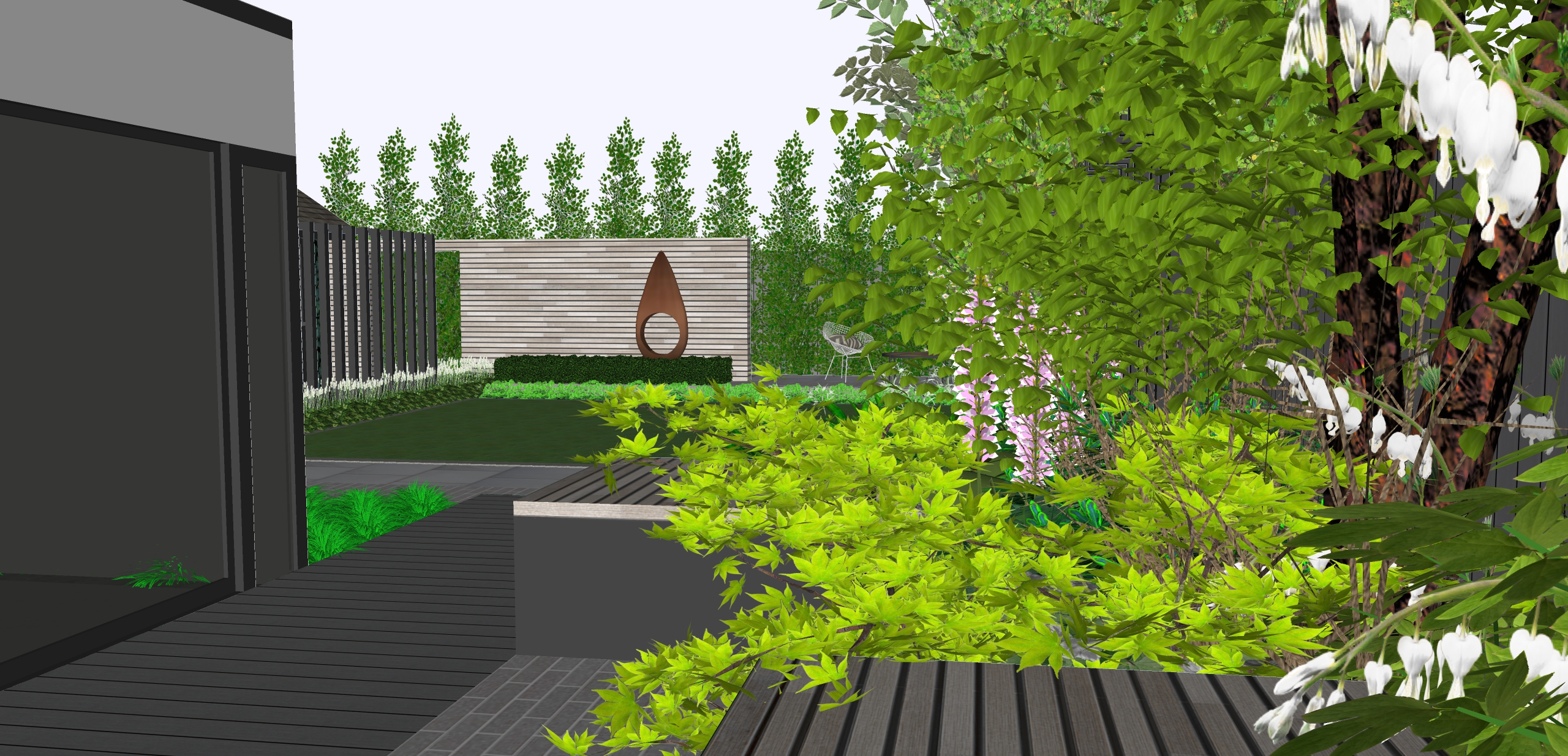 modern house white render large patio doors aluminium frames foreground is in the shade back of garden is in sun surfaces are a mix of grey decking grey stone flag paving beige rectangular setts cube seat made of grey aluminium base with timber top for bench grey arches batton timber screen